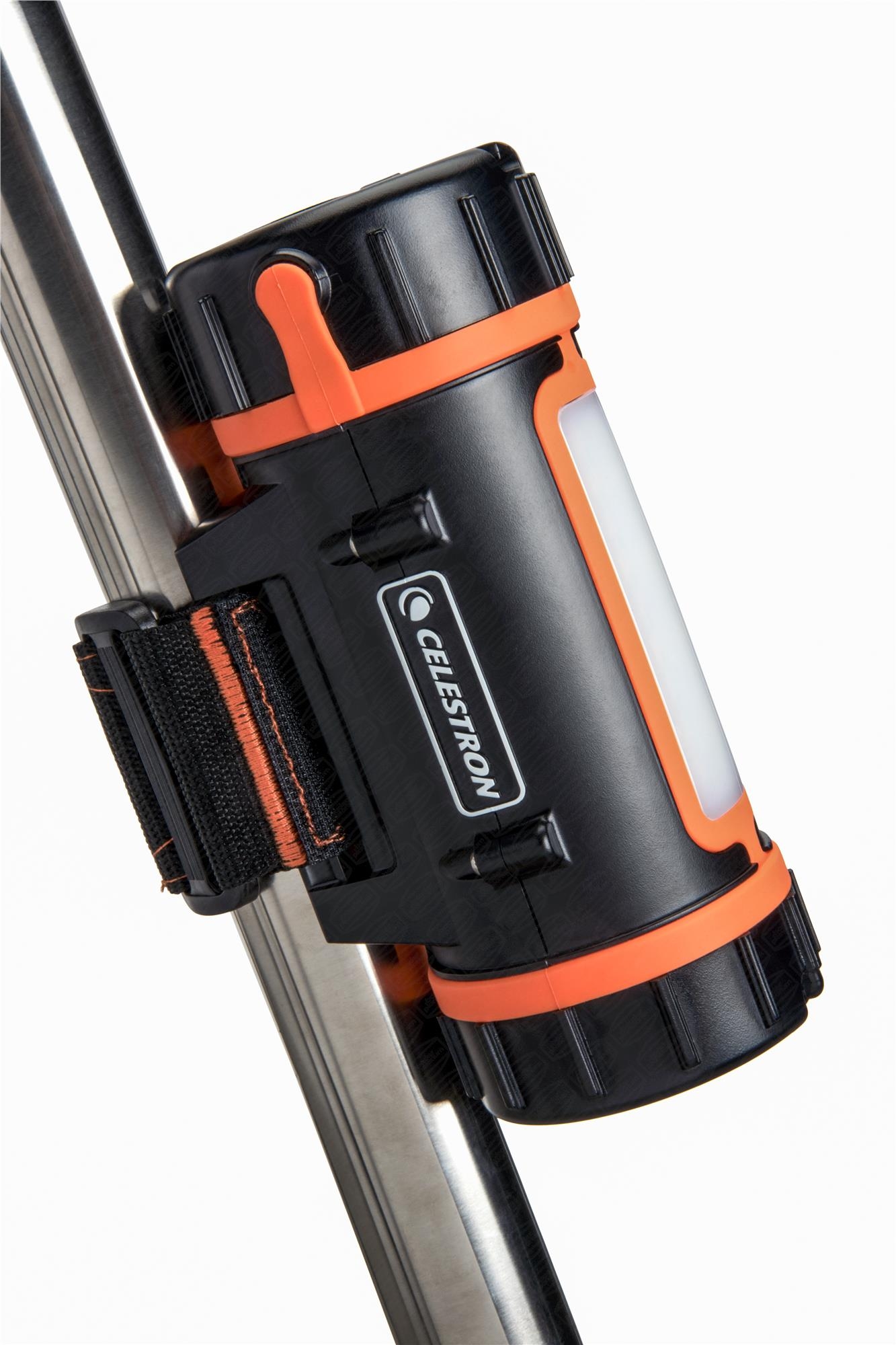 - Svetelný panel LED nahrádza baterku a pri aktivácii sa štandardne rozsvieti na červeno, aby sa zachovala vaša adaptácia na tmu. Biele svetlo sa aktivuje iba stlačením a podržaním vypínača - takže vás náhodne neoslní. V každom prípade sú k dispozícii dva stupne jasu. Nádrž PowerTank možno buď zavesiť pomocou popruhu s karabínou, alebo pripevniť priamo k nohe statívu pomocou popruhu na nohu statívu.