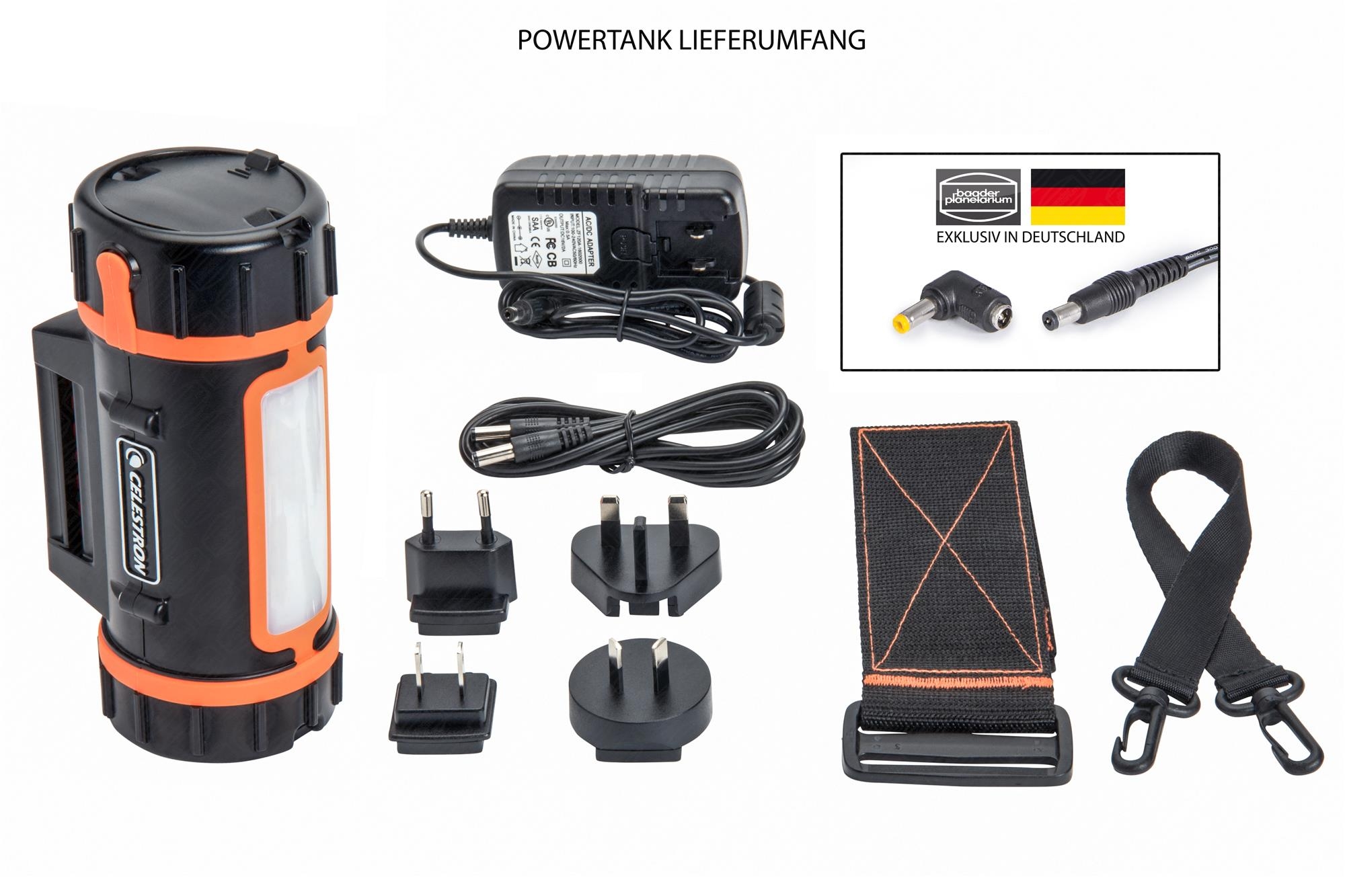 Pouze tie nádrže Celestron PowerTanks, ktoré sa vyrábajú pre nemecký trh, sa dodávajú s uhlovou zástrčkou Protective Disconnect, ktorá znižuje riziko poškodenia, ak niekto zakopne o kábel.Takisto exkluzívne pre Nemecko sú výstražné nálepky, aby ste omylom nepripojili výkonnú nabíjačku PowerTanks k montáži a nezničili elektroniku montáže.