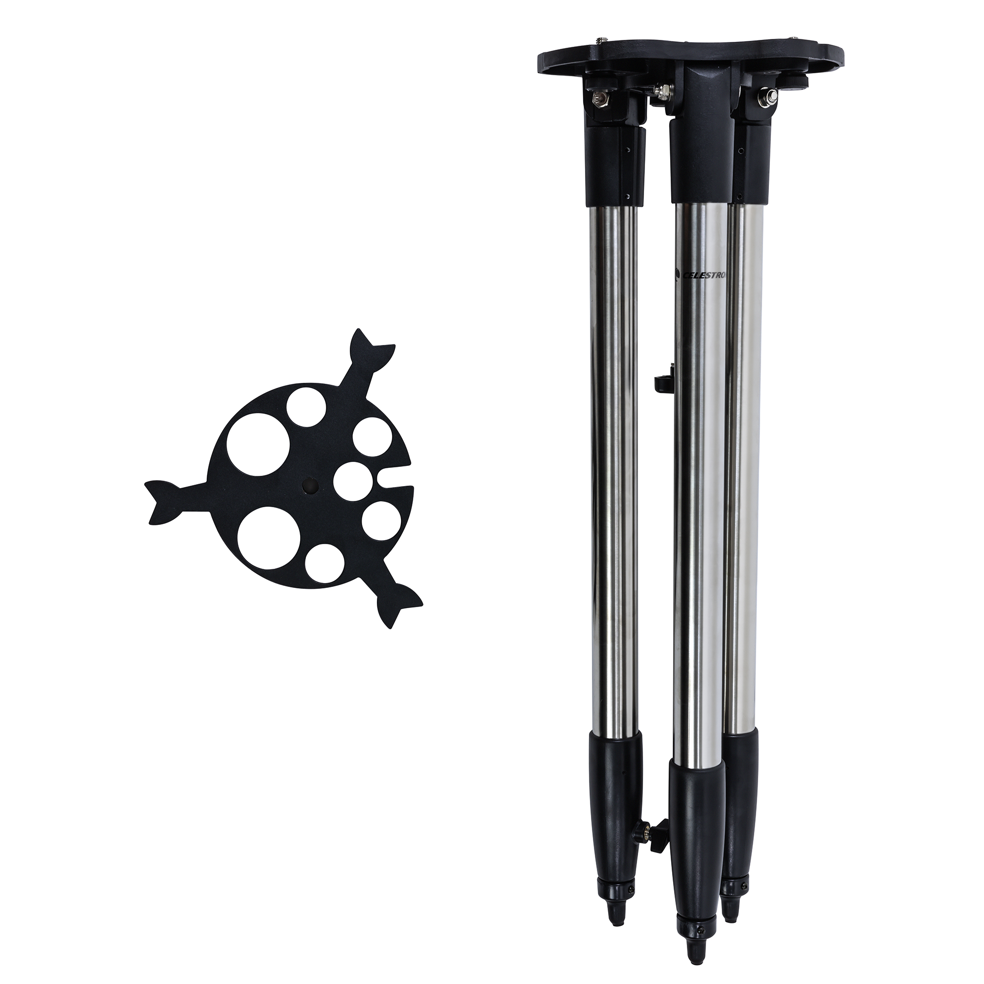 Statív pre stolové Dobsoniany StarSense Explorer je bezpečne pripevnený k Dobsonovej montáži vášho teleskopu pomocou troch skrutiek na spodnej strane montážnej dosky. Integrovaná vanička na príslušenstvo slúži ako stredová podpera, aby bola celá konštrukcia pevná a nepoddajná, a môže tiež pojať až päť ďalších 1¼" okulárov. Celokovový statív je vyrobený z vysokokvalitných materiálov, ktoré vydržia roky používania v náročných vonkajších podmienkach.