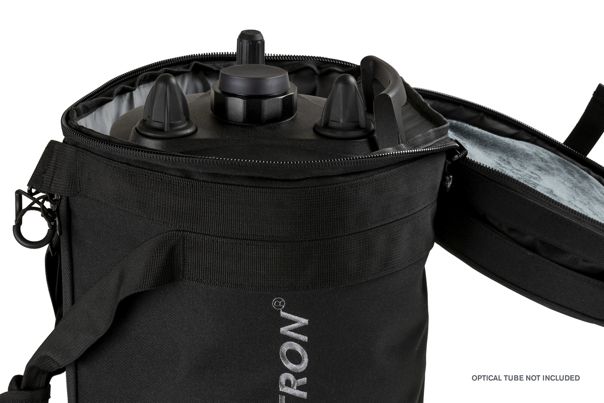 Die Tragetasche besitzt eine versteckte externe Reißverschlusstasche, um Okulare und anderes Zubehör auf zu bewahren. Sie ist mit einem Spanngurt ausgestattet, um die Tasche bei Gebrauch zu fixieren und sie in leerem Zustand platzsparend einzufalten. Im Inneren befindet sich ein eingenähter Spanngurt, der das Fernrohr fest an seinem Platz hält.