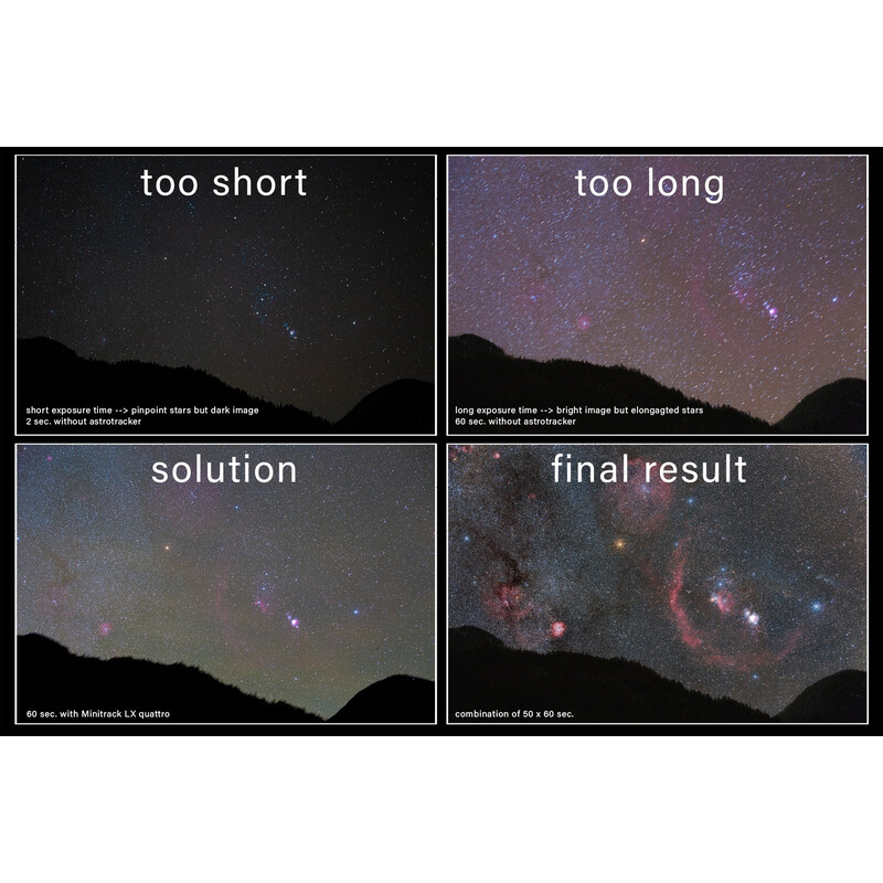 Omegon MiniTrack LX Quattro je mini montáž pre astrofotografiu so širokouhlými a svetelnými teleobjektívmi. Umožní vám robiť fascinujúce snímky hviezdnej oblohy - aj keď ste s astrofotografiou doteraz nemali nič spoločné.
