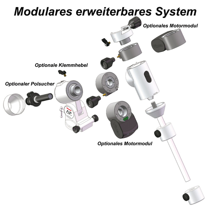 Na zameranie montáže na sever môžete použiť buď polárny ďalekohľad, alebo kompas fotopasce Vixen Polarie. Model Pokročilá Polárka má možnosti pripojenia pre oboje. Kompas má tú výhodu, že sa nemusíte zohýbať pod montážou a môžete polárne nastavovať aj bez toho, aby ste sa pozerali na severnú hviezdu. Pólový vyhľadávač a kompas nájdete v časti "Odporúčané príslušenstvo". Všeobecne možno povedať, že vďaka rozsiahlej ponuke príslušenstva možno držiak rozšíriť podľa vlastných potrieb.