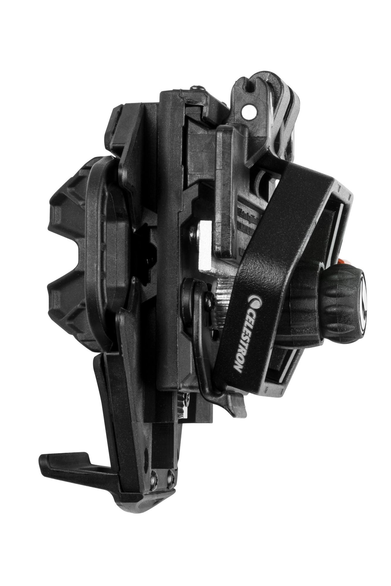 Der NexGO verfügt über Zahnstangen-, X- und Y-Feineinstellungsknöpfe für eine präzise Ausrichtung und lässt sich für den einfachen Transport auf eine kleinere Größe zusammenklappen. Sie können den NexGO Smartphone-Adapter an Ihrem Okular befestigen, indem Sie den orangefarbenen Knopf festziehen, der das Gerät um das Okular herum festklemmt.