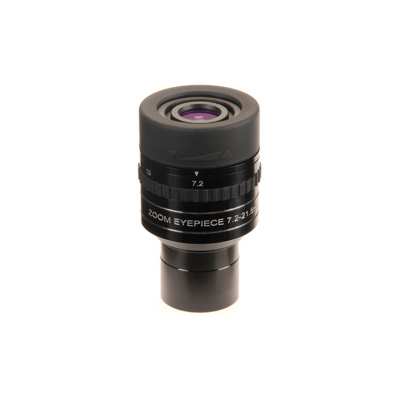 Dieses Zoomokular liefert ein flaches Gesichtsfeld und scharfe, klare und Verzeichnungsfreie Abbildungen. Es stellt eine stufenlose Brennweitenverstellung von 7,2mm bis 21,5 mm und ein scheinbares Gesichtsfeld von 60° bis 40° zur Verfügung. Für einen höheren Komfort sind die Brennweiten 7,2mm, 10mm, 13,5mm und 21,5mm auf dem Gehäuse eingraviert. Das Okular läßt sich extrem weich verstellen und ist eine Freude bei der Beobachtung. Der Augenabstand beträgt 15mm.