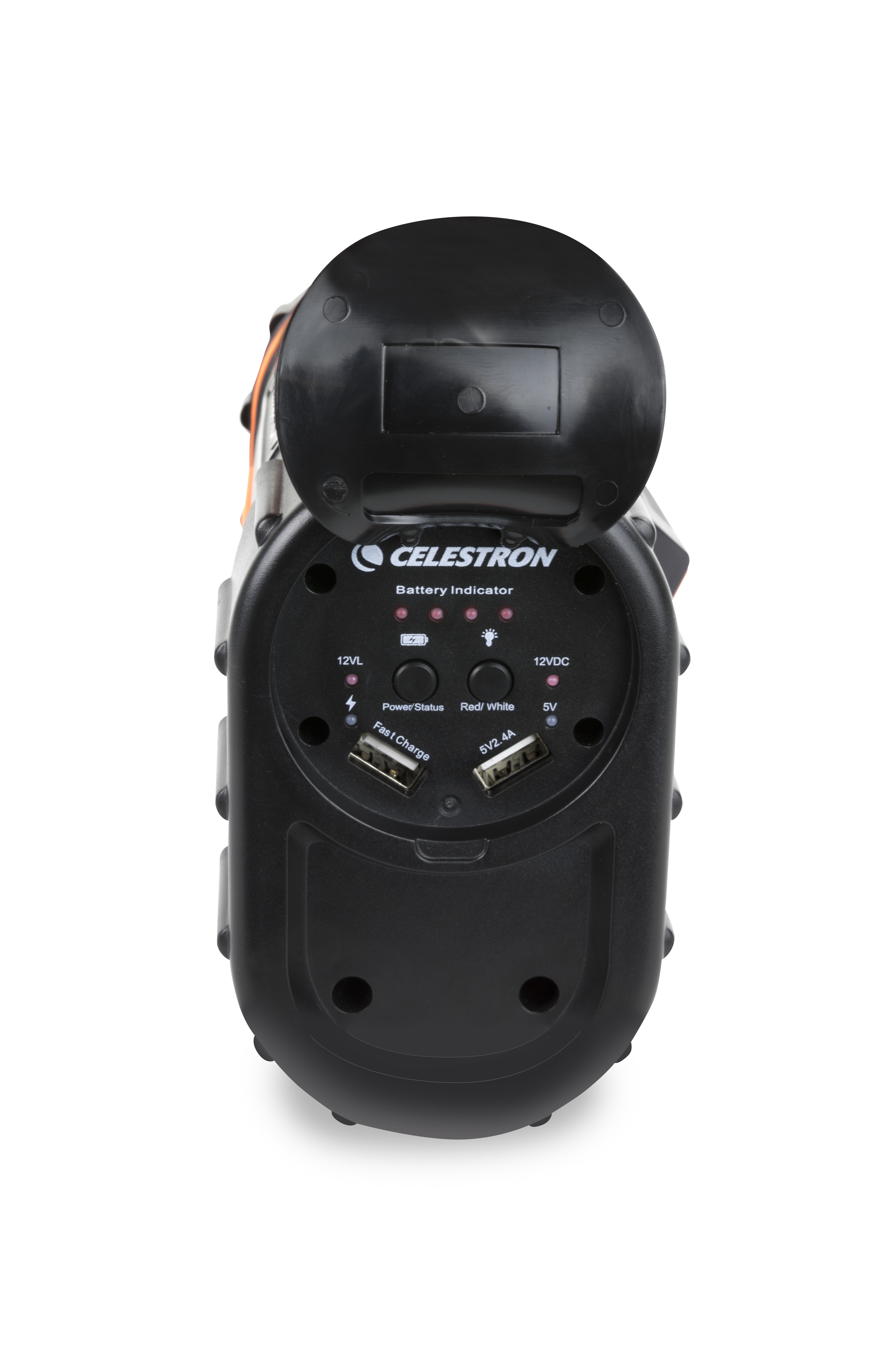 Der PowerTank Lithium Pro verfügt über Anschlüsse für eine Vielzahl von Geräten. Es gibt einen 12V DC 5A Teleskop-Stromanschluss (Celestron-Kabel im Lieferumfang enthalten), einen 12V DC 10A Autobatterieadapteranschluss und zwei 5V DC USB-Anschlüsse - einen mit 2,1 A und einen für schnelles Laden.