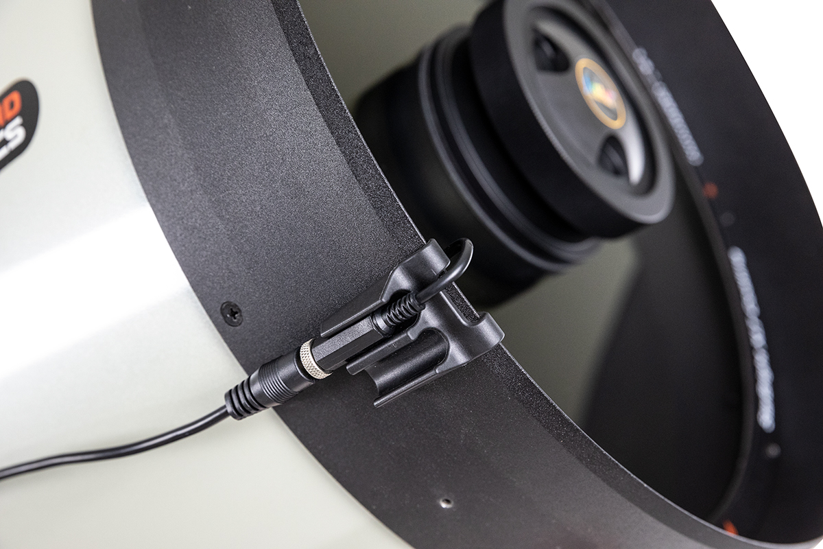 Der Tauschutz-Heizring wird außerdem mit einem Kabelmanagement-Clip geliefert, der am vorderen Tubusring befestigt werden kann. Damit können Sie die Strom- und Thermistorbuchse zur Zugentlastung befestigen und die Anschlusskabel sauber verlegen.