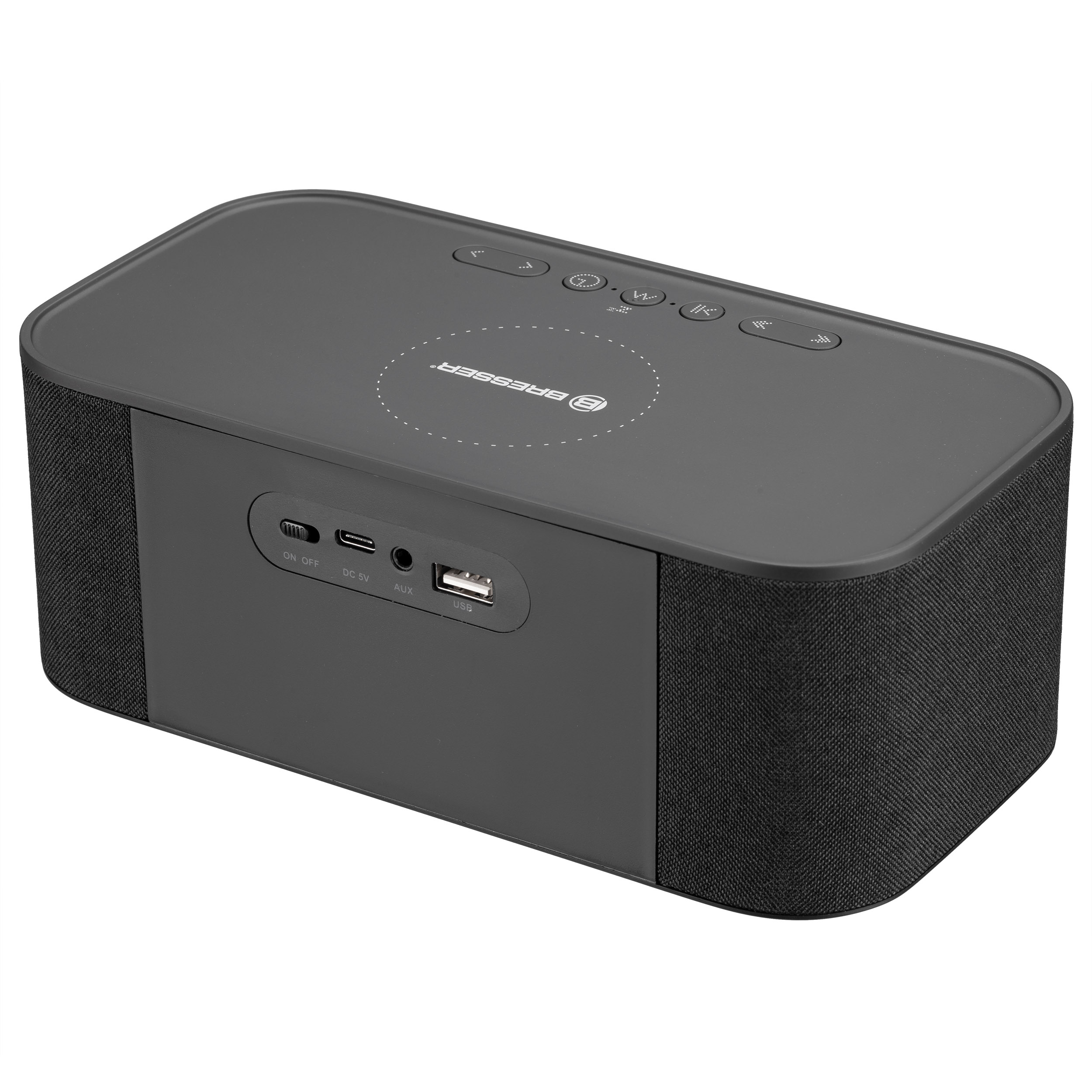 Stereo reproduktor BRESSER Bluetooth vás zaujme nielen svojím moderným dizajnom, ale aj vynikajúcim zvukom kdekoľvek a kedykoľvek, takže si môžete vychutnávať hudbu až 6 hodín bez prerušenia. Vstavaný mikrofón uľahčuje prijímanie hovorov. Reproduktor Bluetooth má aj funkciu bezdrôtového nabíjania, nabíjací port USB a batériu s kapacitou 4400 mAh na nabíjanie vašich mobilných zariadení. Na modernom kryte potiahnutom látkou sa zobrazuje čas a čas budíka.