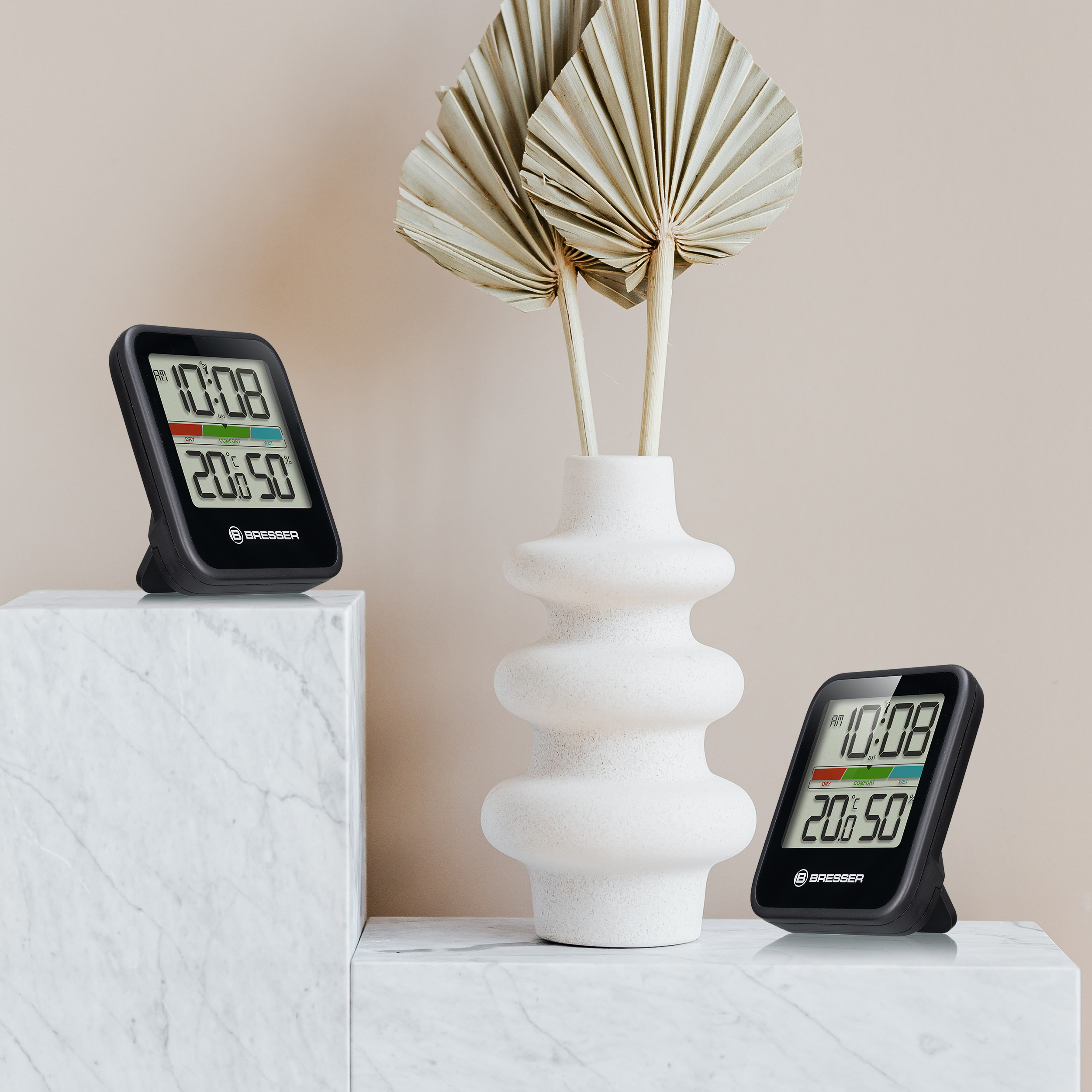 Spálňa, kuchyňa a pracovňa alebo detská izba: 3-dielna súprava teplomerov a vlhkomerov BRESSER Climate Monitor DCF vám ukáže, aká je vnútorná klíma na troch rôznych miestach. Koniec koncov, teplota a vlhkosť v interiéri musia byť správne, aby sme sa cítili pohodlne - a zostali zdraví. Ak je vzduch dlhodobo príliš vlhký, môžu sa tvoriť škodlivé plesne. Ale aj príliš nízka vlhkosť nám môže rýchlo spôsobiť problémy. Často si to všimneme, keď počas chladných dní dlho sedíme vo veľmi vyhriatych miestnostiach. Preto má zmysel nikdy nestratiť prehľad o vnútornej klíme pomocou termo- / vlhkomerov - pre naše zdravie a pohodu!