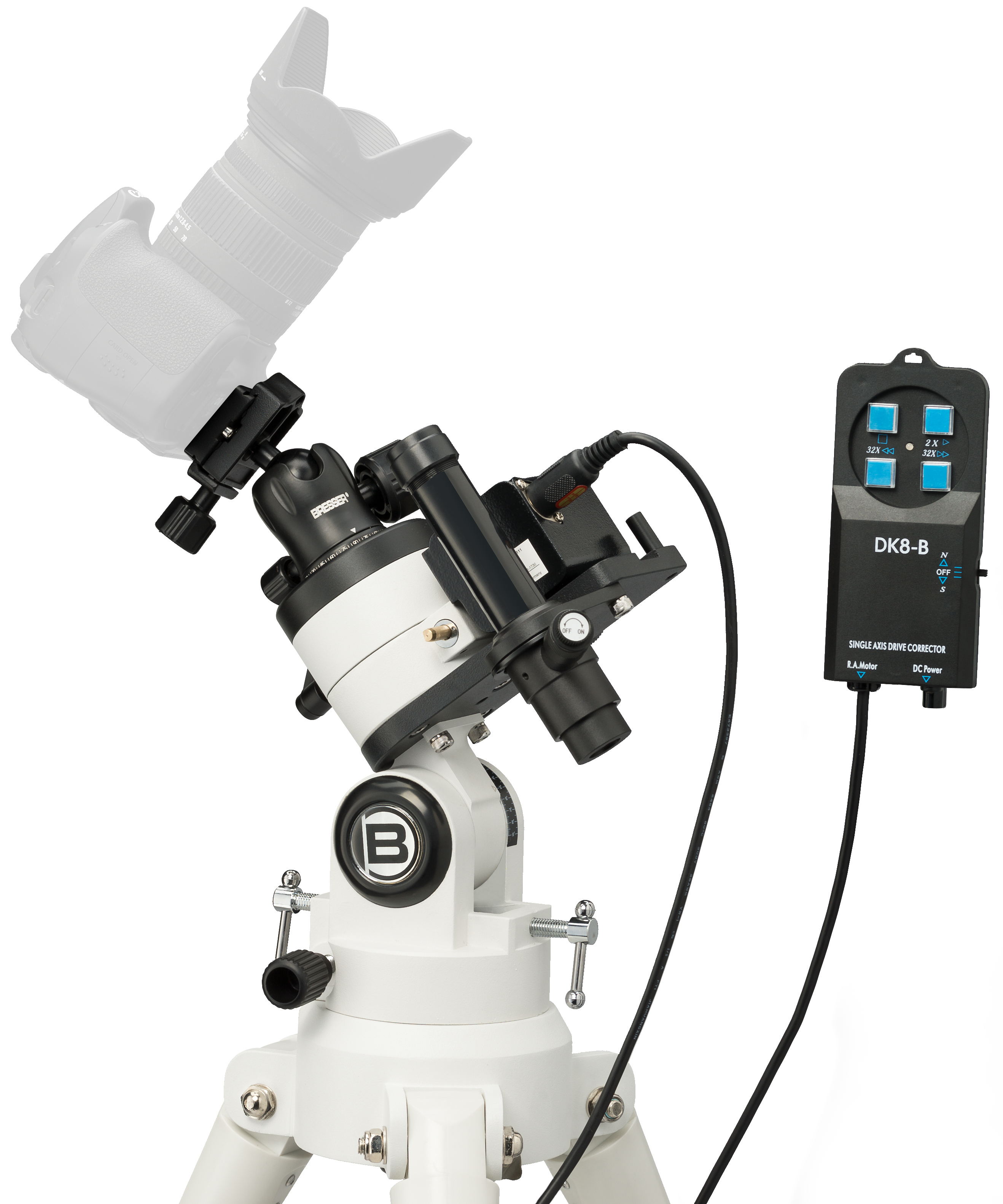 Foto držiak Bresser je určený na prenášanie a sledovanie fotoaparátu s objektívom s celkovou hmotnosťou max. 2,5 kg. Rýchle širokouhlé objektívy sú ideálne na začiatok, pretože požiadavky na presnosť sledovania sa zvyšujú s rastúcou ohniskovou vzdialenosťou objektívu a časom expozície. To znamená, že obraz so širokouhlým objektívom možno bez problémov exponovať až niekoľko minút a hviezdy zostanú bodové. Napríklad pri 200 mm teleskopickom objektíve musí byť polárne vyrovnanie fotografickej montáže presne v poriadku. To sa však rýchlo dosiahne vďaka optickému a osvetlenému polárnemu hľadáčiku. Typicky dosiahnuteľné expozičné časy s dobrou presnosťou sledovania sú 16-35 mm širokouhlý objektív: 10 minút (600 s) , 200 mm teleobjektív: 5 minút (300 s)
