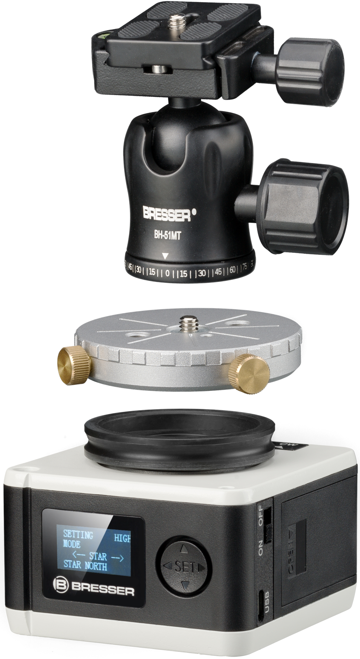 Fotoprístroj BRESSER je určený na prenášanie a sledovanie fotoaparátu s objektívom s celkovou hmotnosťou max. 2,0 kg v polárnom režime. V azimutálnom režime držiak prenáša aj fotoaparáty s celkovou hmotnosťou do 5,0 kg. Na začiatku sú ideálne rýchle širokouhlé objektívy, pretože požiadavky na presnosť sledovania sa zvyšujú s rastúcou ohniskovou vzdialenosťou objektívu a časom expozície. Napríklad snímka zhotovená širokouhlým objektívom môže byť bez problémov exponovaná až niekoľko minút a hviezdy zostanú bodové. Napríklad pri teleobjektíve s ohniskovou vzdialenosťou 200 mm musí byť polárne vyrovnanie fotomontáže presne správne. To sa rýchlo vykoná pomocou integrovaného zarovnávacieho tunela na zameranie na polárnu hviezdu.
