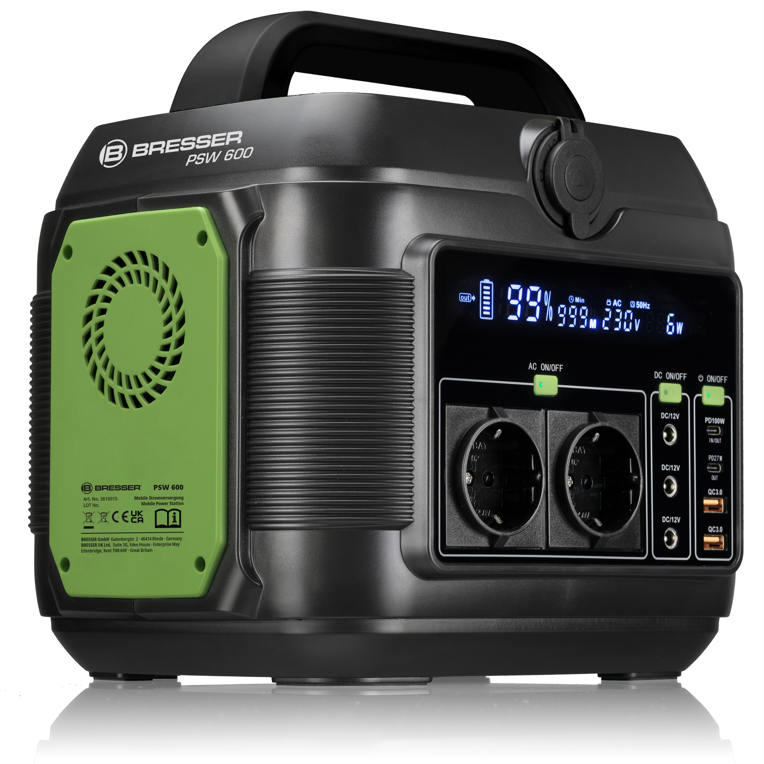 Na cestách majte vždy dostatok energie: Umožní vám to 600 W mobilná powerbanka od spoločnosti BRESSER. Či už na kempovaní, pri práci na záhrade alebo počas výpadku prúdu doma, vďaka mnohým rôznym možnostiam pripojenia môžete bezpečne a spoľahlivo nabíjať a prevádzkovať takmer všetky bežné elektrické zariadenia. Ideálna pre notebooky, hudobné nástroje atď: Vysokokvalitný výstup 230 V 600 W s čistou sínusovkou dodáva energiu aj citlivým zariadeniam. Vo vysokokvalitnom zásobníku energie je nainštalovaná výkonná lítium-iónová batéria s kapacitou 576 Wh a kapacitou 40 Ah/14,4 V. Na rozdiel od generátorov energie so spaľovacími motormi mobilná elektráreň boduje aj svojou tichou a ekologickou prevádzkou. S voliteľným solárnym panelom (nie je súčasťou dodávky) môžete pre mobilné napájanie využiť aj silu slnka. Jednoduché priame nabíjanie cez sieťový adaptér alebo solárny panel sa môže vykonávať prostredníctvom vstupnej zásuvky DC.