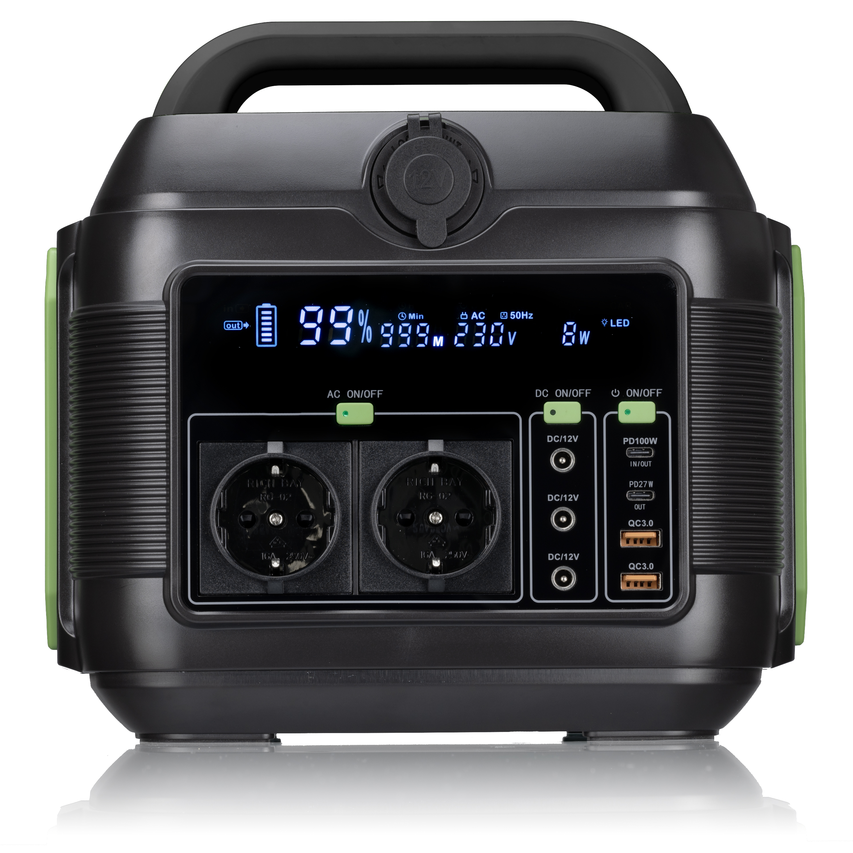 2x USB-A, 2x USB-C, 3x 12V-DC5.5/2.1, 1x 12V zásuvka do auta, 2x 230V-AC