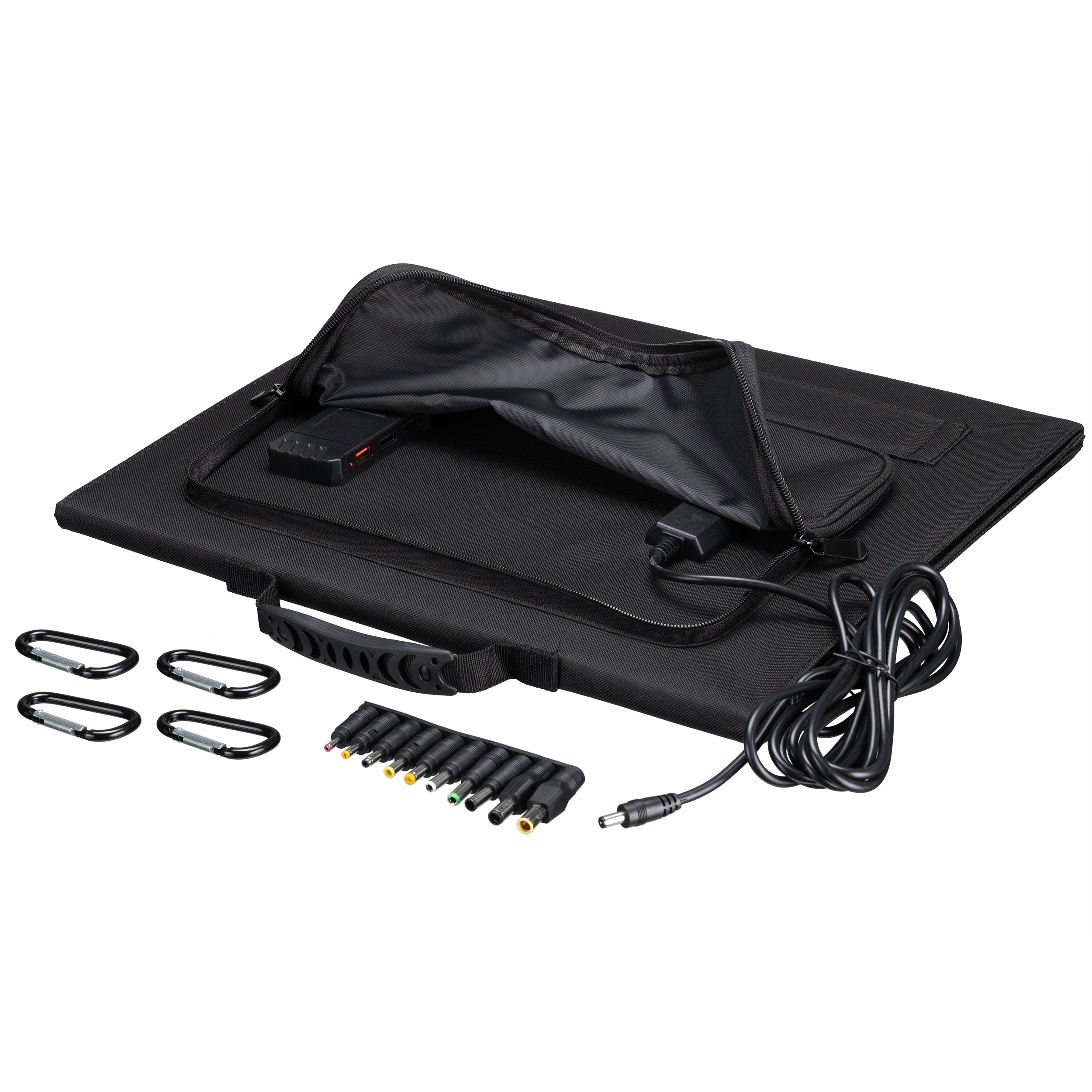 Aby ste mohli solárny panel bezpečne pripevniť na objekt a dokonale ho nastaviť na slnko, súčasťou dodávky sú 4 robustné háčiky na karabíny. Jednoducho ich pripevnite k nitovaným očkám na solárnom paneli a pomocou nich solárnu nabíjačku bezpečne pripevnite napr. k pútku na stan, k plotu alebo k iným vhodným upevňovacím bodom.