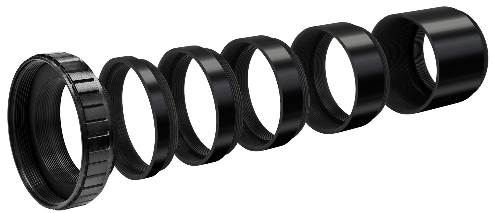 V astrofotografii sa fotoaparáty zvyčajne pripájajú k teleskopu pomocou medzinárodného štandardného závitu T2 (M42x0,75). Adaptéry z ohniska teleskopu na T2 a z krúžku T2 na pripojenie fotoaparátu však často nestačia; musia sa dodržať aj určité vzdialenosti. To platí najmä pri použití korektorov, redukcií alebo sploštovačiek. Tu pomôže táto sada predlžovacích objímok. Objímky sú dlhé 5 mm, 7,5 mm, 10 mm, 15 mm a 30 mm a možno ich kombinovať na dosiahnutie takmer akejkoľvek požadovanej vzdialenosti. Každá objímka má na jednej strane vnútorný závit T2 a na druhej strane vonkajší závit T2.