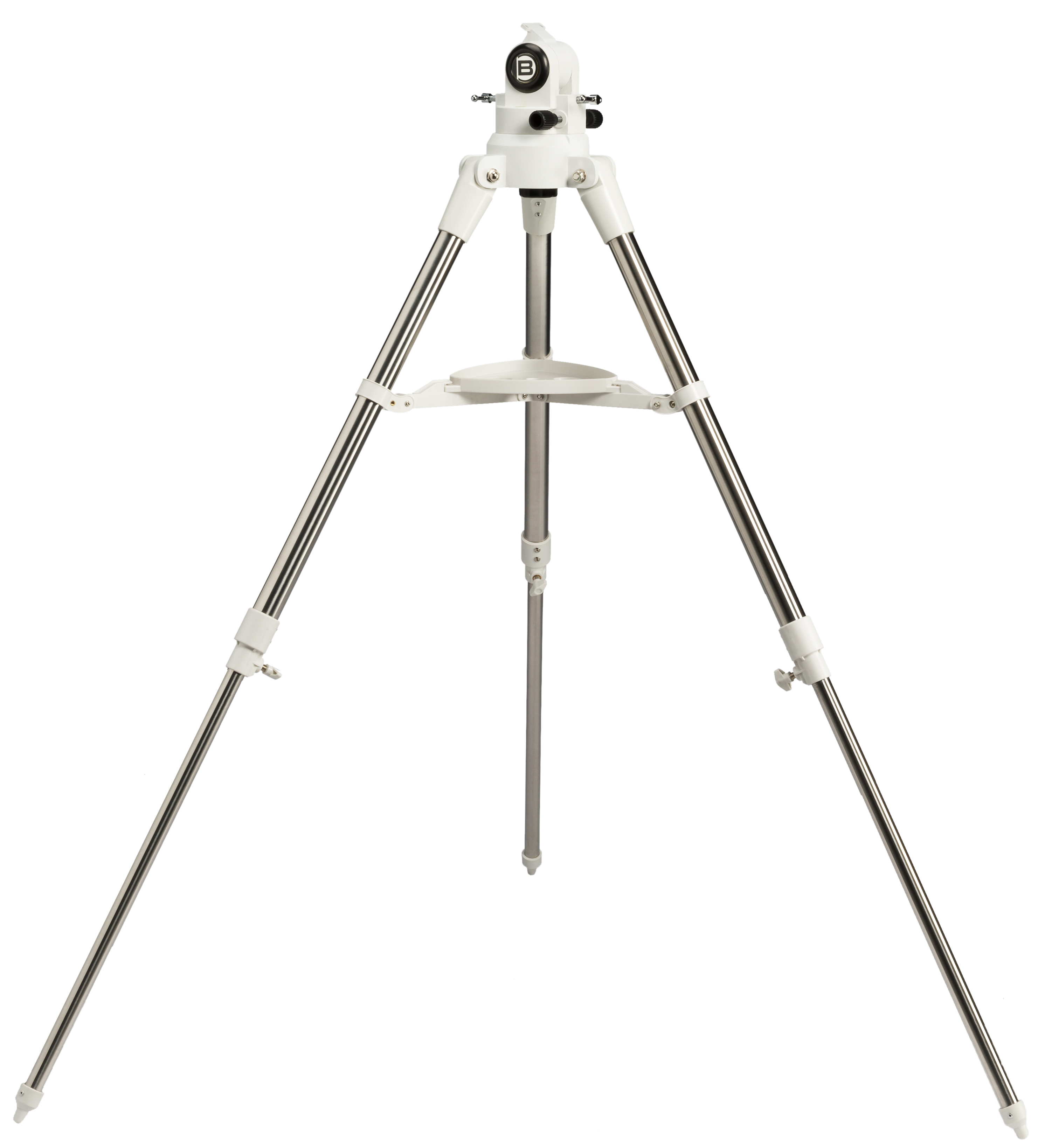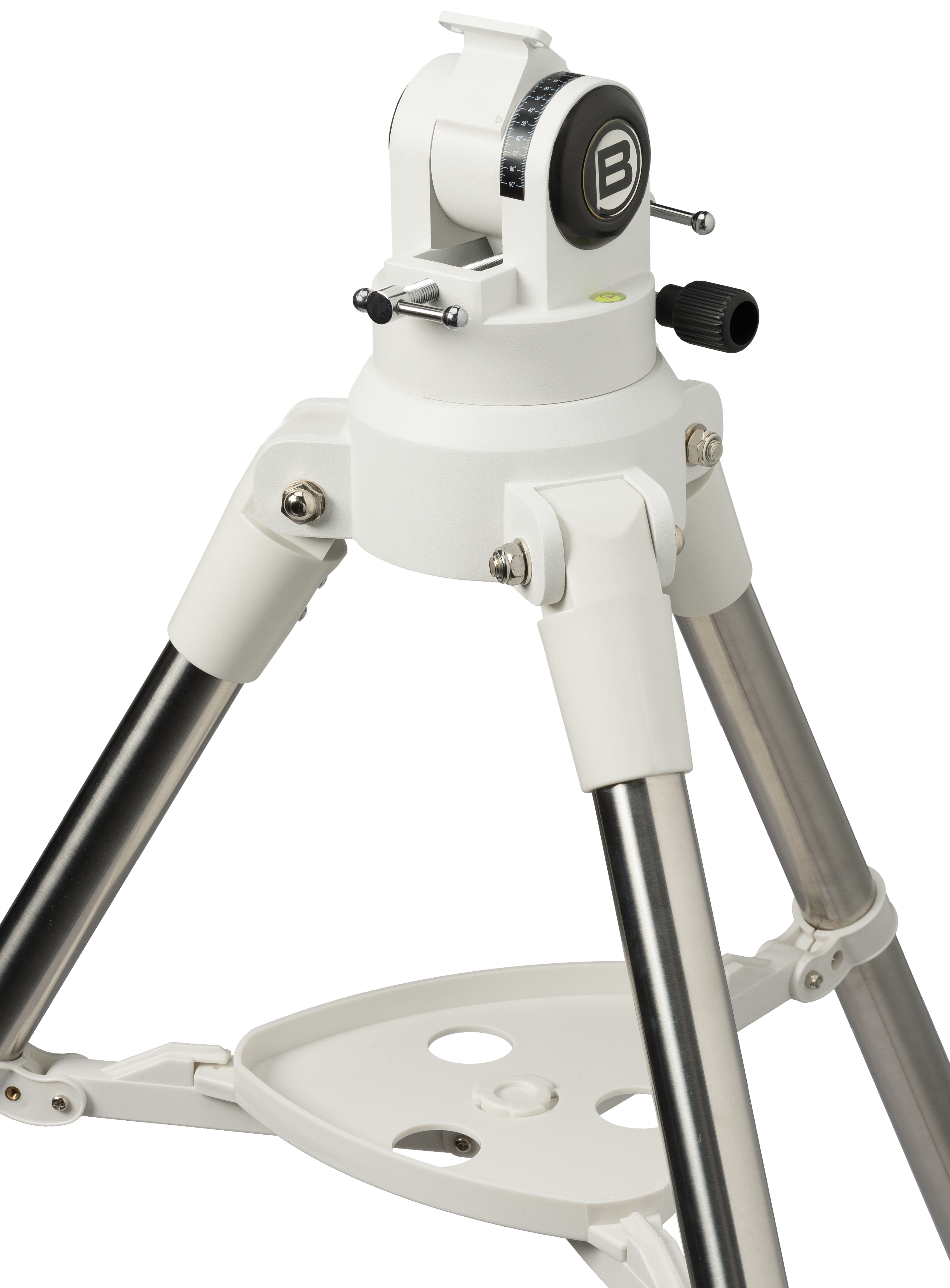 Potom je výškovo nastaviteľný statív z nehrdzavejúcej ocele s integrovanou polárnou kolískou od spoločnosti BRESSER mimoriadne stabilnou základňou. Výška pólu (zemepisná šírka) a azimut sa nastavujú pomocou veľkých skrutiek s vrúbkovaním a tommy. Vďaka kruhovej bublinkovej vodováhe integrovanej v hlave statívu je aj vyrovnávanie fotopasce hračkou. Fotopasca BRESSER je pevne spojená so statívom pomocou dvoch skrutiek s 1/4'' fotografickým závitom. Vzdialenosť medzi dvoma otvormi je 35 mm, priemer otvoru je 6,3 mm a je vhodný pre skrutky s 1/4" foto závitom.