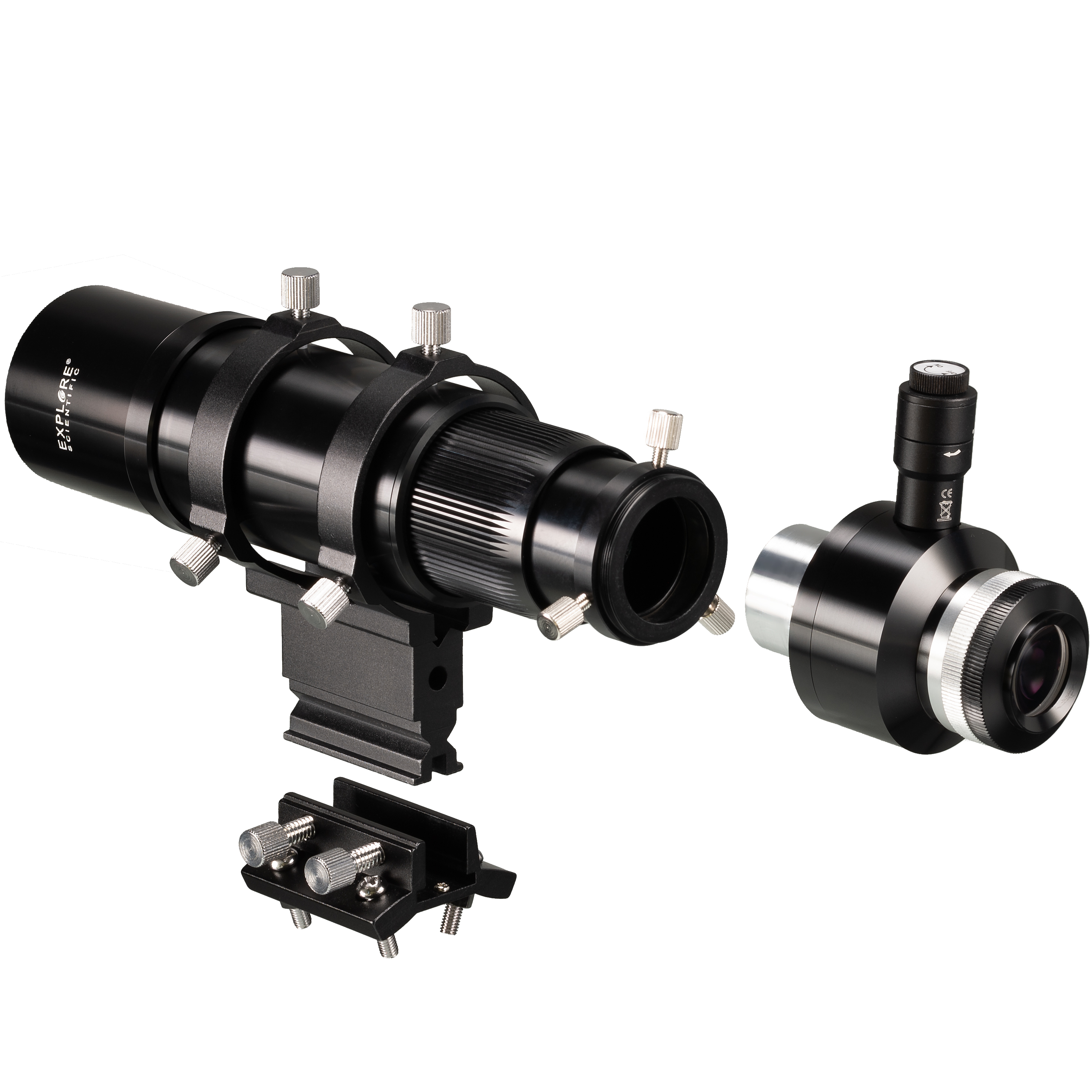 Držiak tohto hľadáčika a vodiaceho ďalekohľadu je celý vyrobený z hliníka a tvorí stabilnú základňu. Držiak hľadáčika je vhodný pre mnohé bežné typy teleskopov, napr. pre EXPLORE SCIENTIFIC, BRESSER MESSIER atď. Ak nie je existujúca pätka hľadáčika kompatibilná, súčasťou dodávky je aj vhodná pätka hľadáčika. Tú možno pripevniť k tubusu teleskopu pomocou 4 skrutiek M5. Rozstup otvorov vyhľadávacej pätky je 31,7 mm v pozdĺžnej a priečnej osi. Vďaka 6 veľkým nastavovacím skrutkám s protišmykovým vrúbkovaním sa hľadáčik ľahko nastavuje aj s roztrasenými prstami. Všetky nastavovacie a upínacie skrutky majú plastové hroty, ktoré účinne zabraňujú poškriabaniu krytu hľadáčika a držiaka hľadáčika.