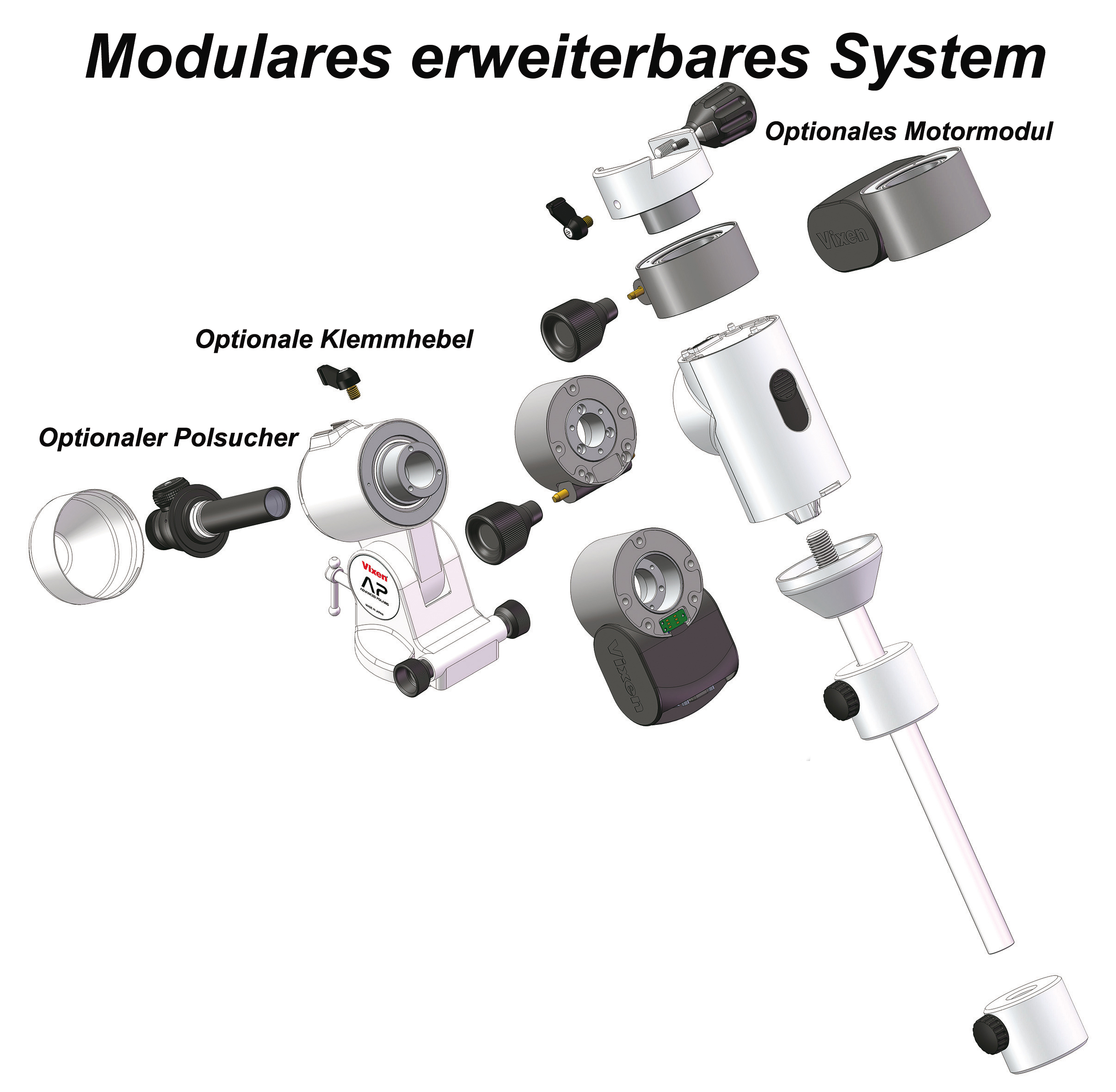 Držiak AP-SM je rozšírením osvedčeného držiaka Vixen AP o motor RA a riadiacu jednotku STAR BOOK ONE. Umožňuje bezpečnú a stabilnú montáž vášho teleskopu. Pomocou mechanizmu klznej spojky ho možno tiež rýchlo nastaviť na cieľový objekt.