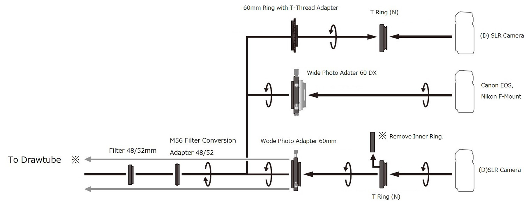 Závit M56 filtračného adaptéra sa naskrutkuje napríklad do Wide Photo Adapter AD 60DX a potom ponúka prispôsobenie na závity filtrov M52 a M48 pre rôzne hmlovinové filtre na fotografovanie. Adaptér je vybavený závitom 48 mm a 52 mm. Adaptačný krúžok možno použiť na široký fotografický adaptér 60DX, široký fotografický adaptér 60 mm, 60 mm krúžok s adaptérom s T-závitom alebo EA60 mm do 50,8 mm.