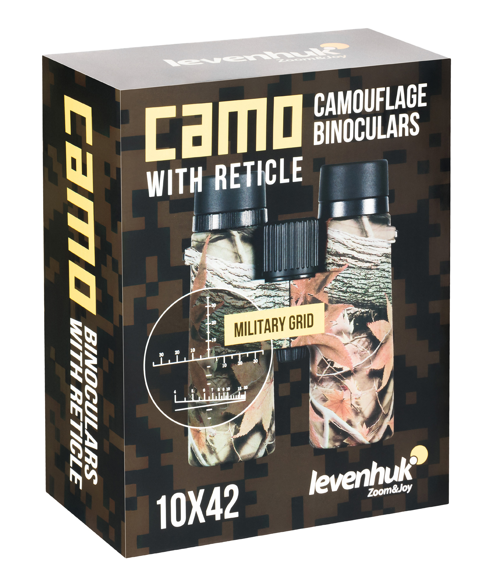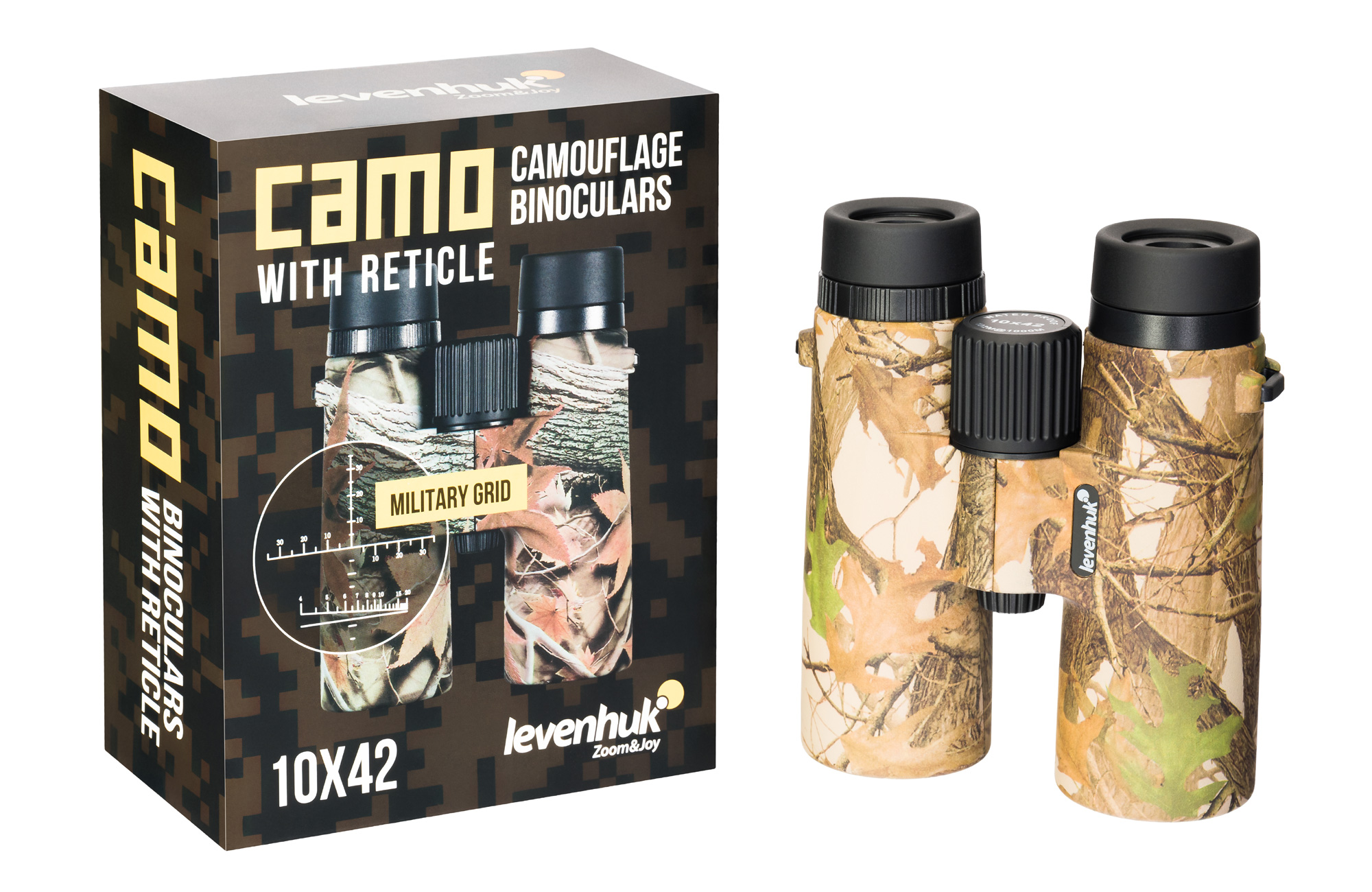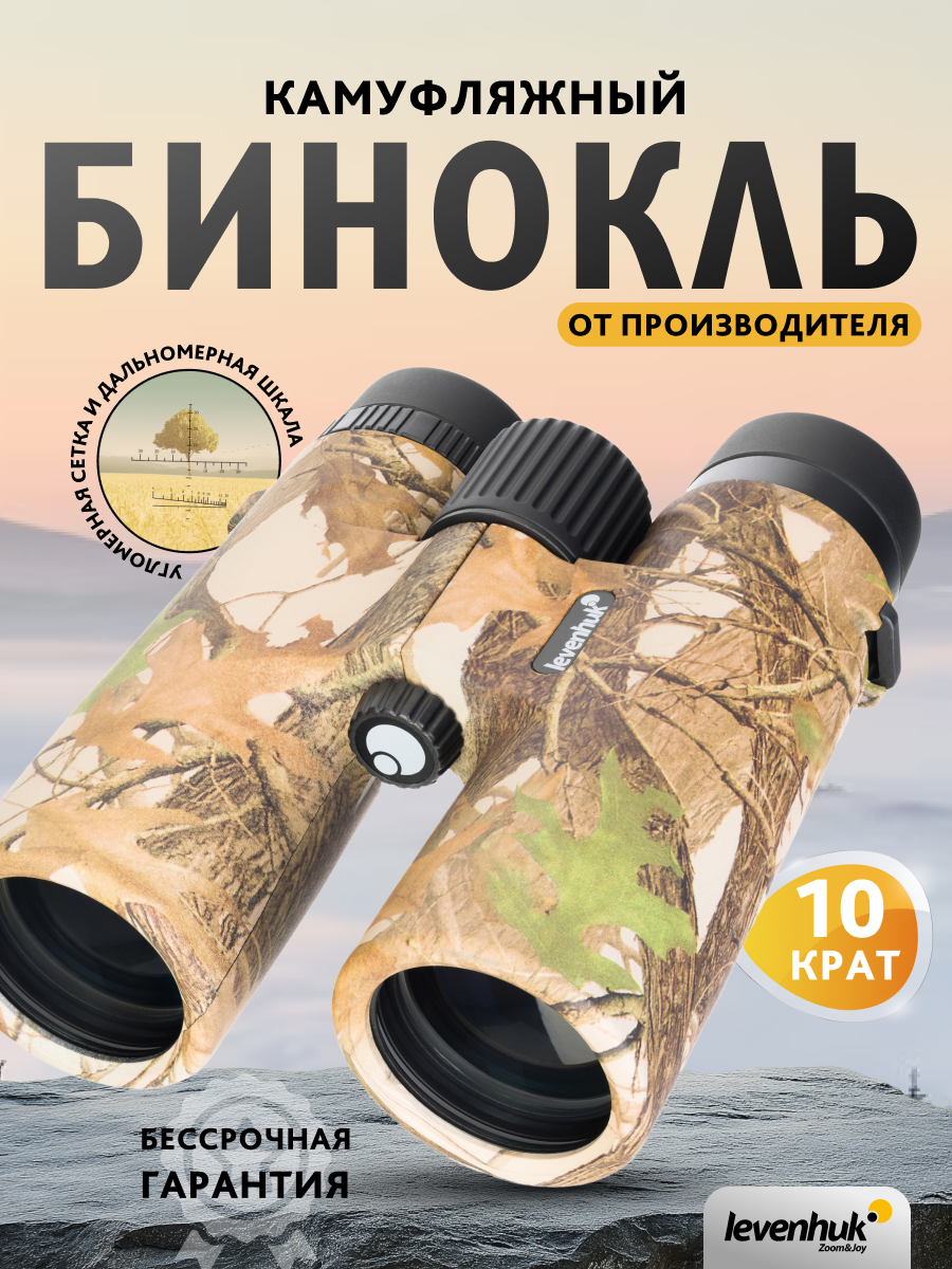 Binokulárny ďalekohľad so zameriavačom Levenhuk Camo Dots 10x42 je optický prístroj pre lovcov, rybárov, turistov a všetkých priaznivcov aktívneho životného štýlu. Tento model má všetko, čo môže poľný binokulárny ďalekohľad ponúknuť - výkonné 10x zväčšenie, klasické 42mm objektívy, vodotesné a vysoko odolné telo v maskovacom prevedení. Jeden z okulárov má navyše rastrový zameriavací kríž a mierku na meranie vzdialenosti, ktoré umožňujú vypočítať vzdialenosť k cieľu, určiť jeho výšku a zmerať horizontálny uhol a uhol námeru. Skvelá funkcia pre lov!