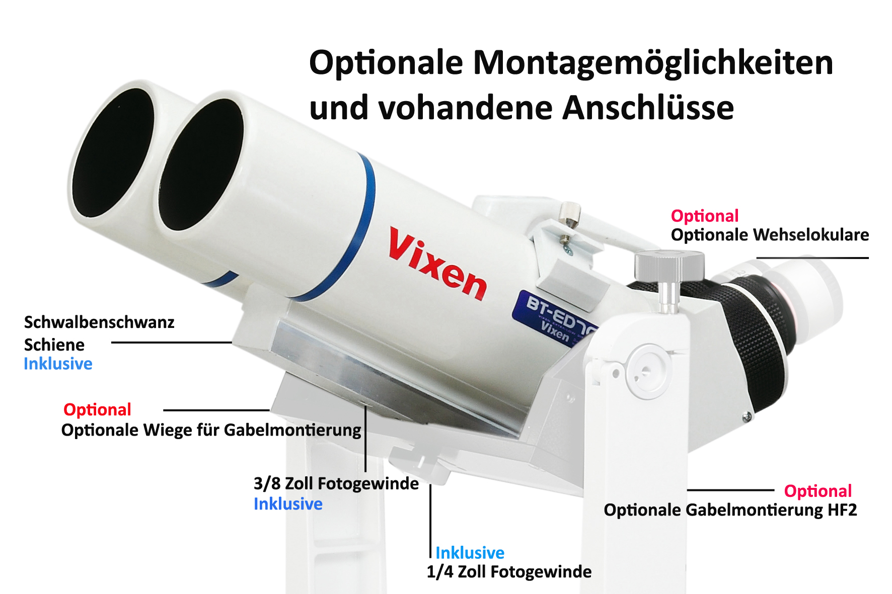 Ďalekohľad má štandardnú holubičiu lištu Vixen, ako aj 1/4 a 3/8 palcový závit , a preto sa dá používať so všetkými štandardnými statívmi a montážami. Na montáž však odporúčame vidlicový držiak Vixen HF2. Ten ponúka dokonalý komfort pozorovania a takmer žiadne vibrácie vďaka prepracovanej konštrukcii a hladko fungujúcej mechanike. Pevná montáž so statívom je jednou z najdôležitejších súčastí, najmä pri astronomických pozorovaniach. Zaručuje pozorovanie bez chvenia a umožňuje rozpoznať aj tie najjemnejšie detaily.