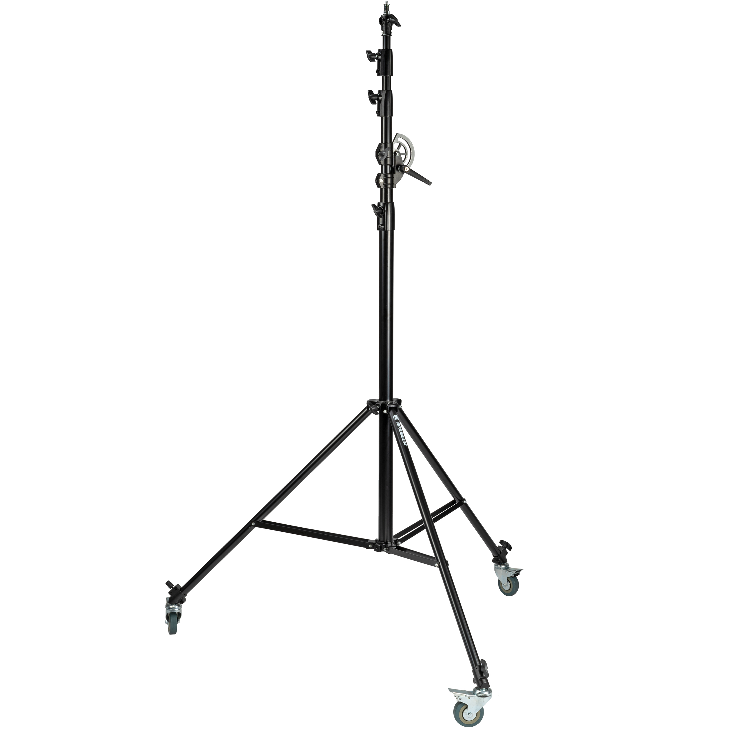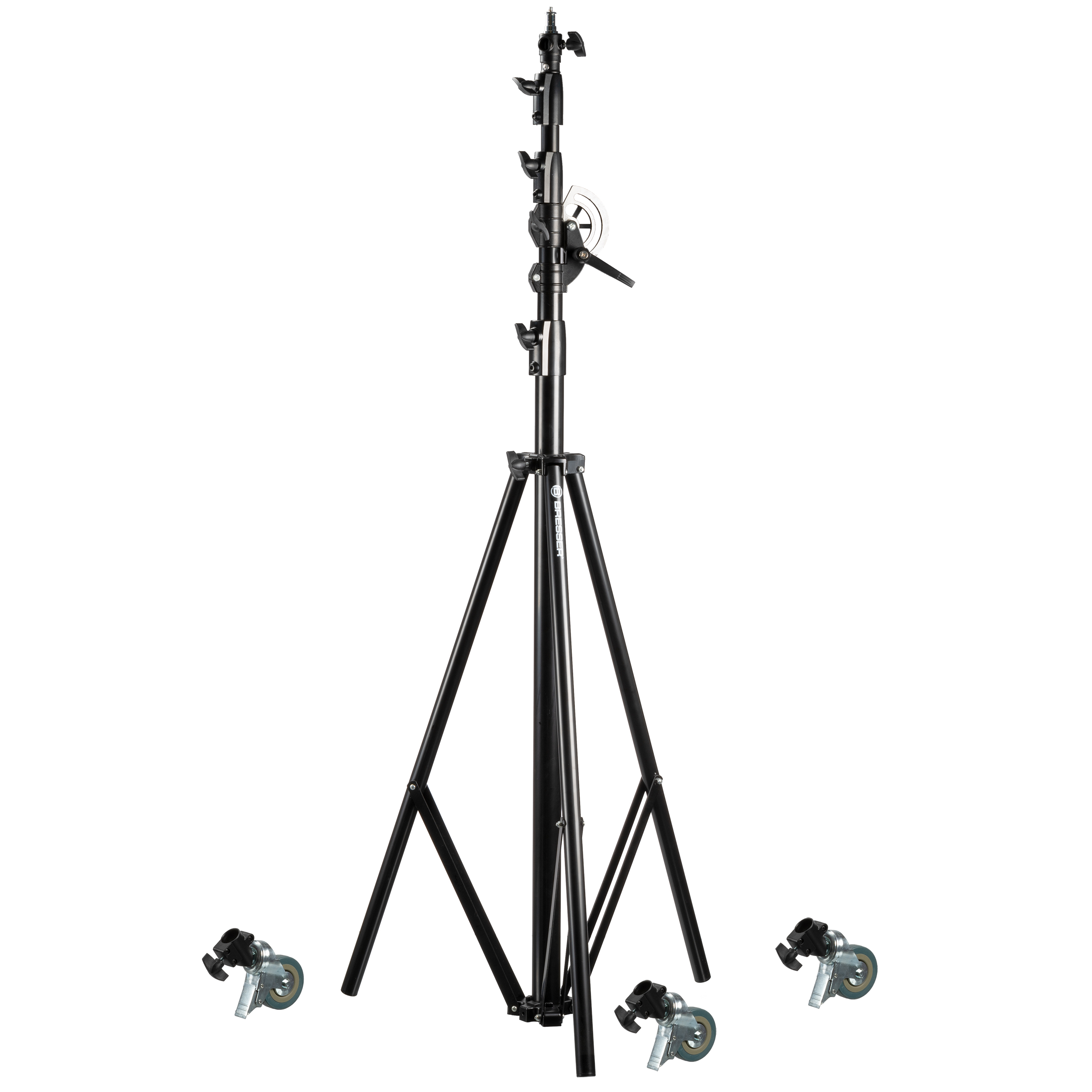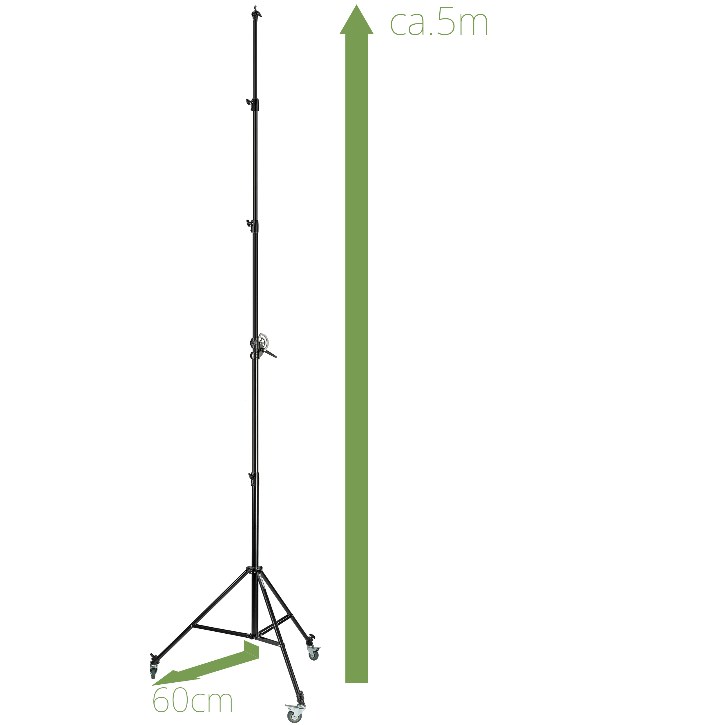 Veľmi profesionálny, pevný a stabilný hliníkový stojan na lampy, ktorý sa rýchlo a ľahko rozkladá a dá sa premiestniť do akejkoľvek polohy. Hladko sa pohybujúce kolieska majú priemer 7,5 cm a sú vybavené brzdným systémom. Aj pri použití najväčších softboxov je celok stále veľmi stabilný.