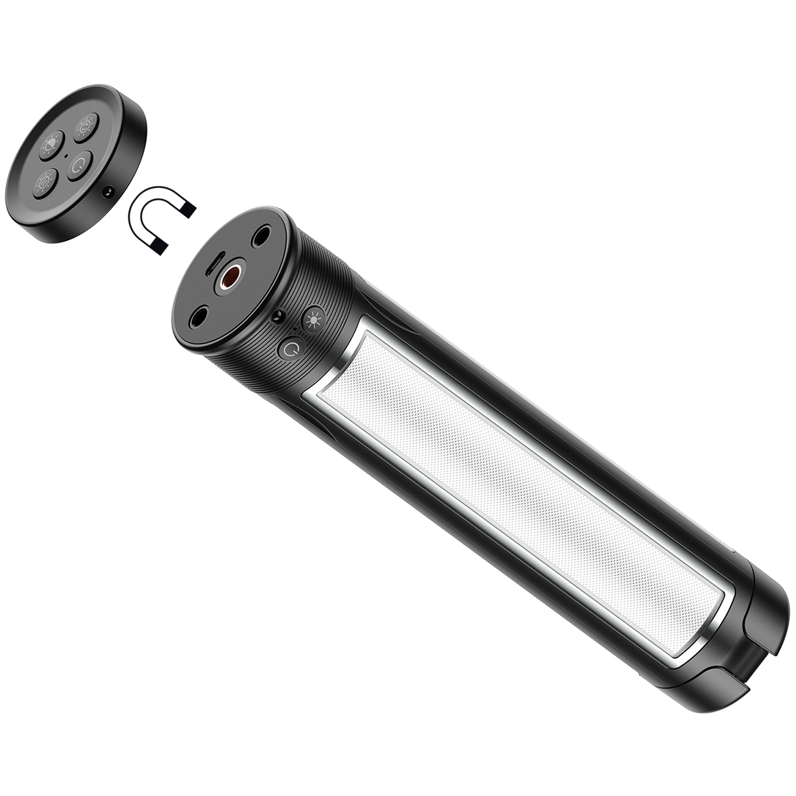 Vrcholom je diaľkové ovládanie, ktoré sa dá pomocou magnetu pripevniť na spodnú časť svietidla. Svetlo LED v praktickom formáte baterky sa plne nabije po 4 hodinách prostredníctvom dodávaného kábla USB a nabíjacej prípojky 5 V 2A typu C (nie je súčasťou balenia). Vďaka dobíjateľnej lítiovej batérii potom poskytuje svetlo v tme po dobu 4 hodín. Praktické a stabilné: multifunkčné svetlo LED sa dá jednoducho pripevniť na statív pomocou štandardného ¼'' závitu.