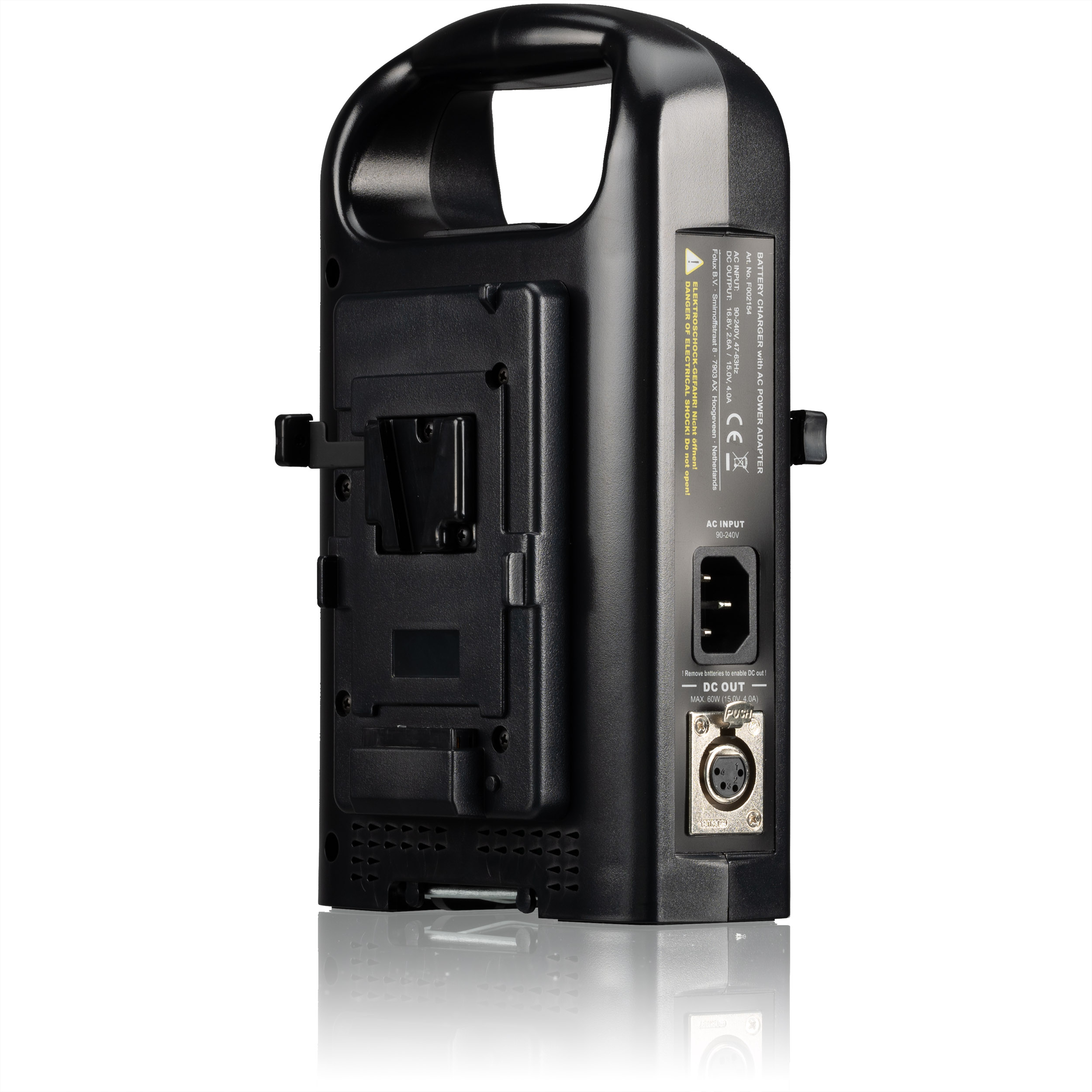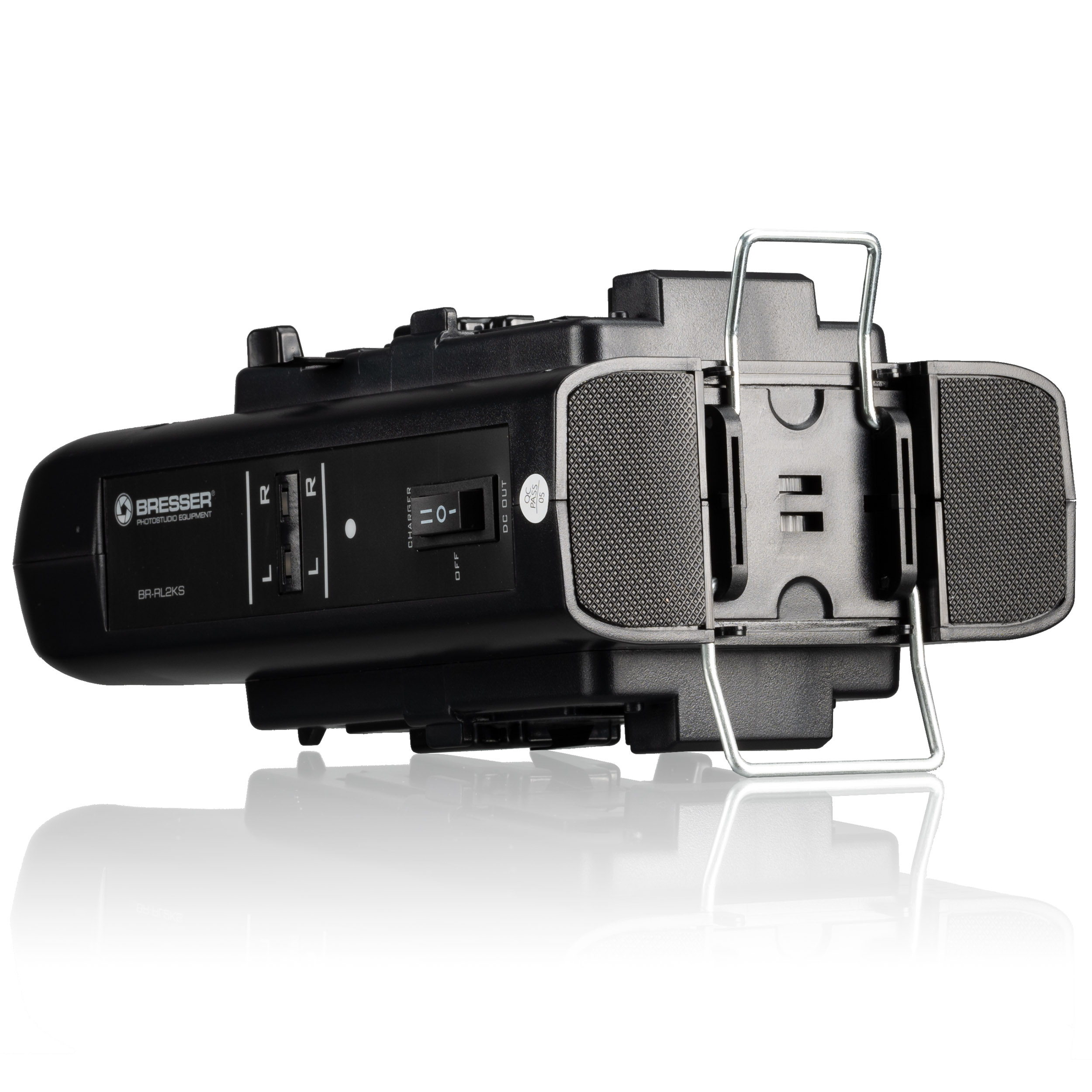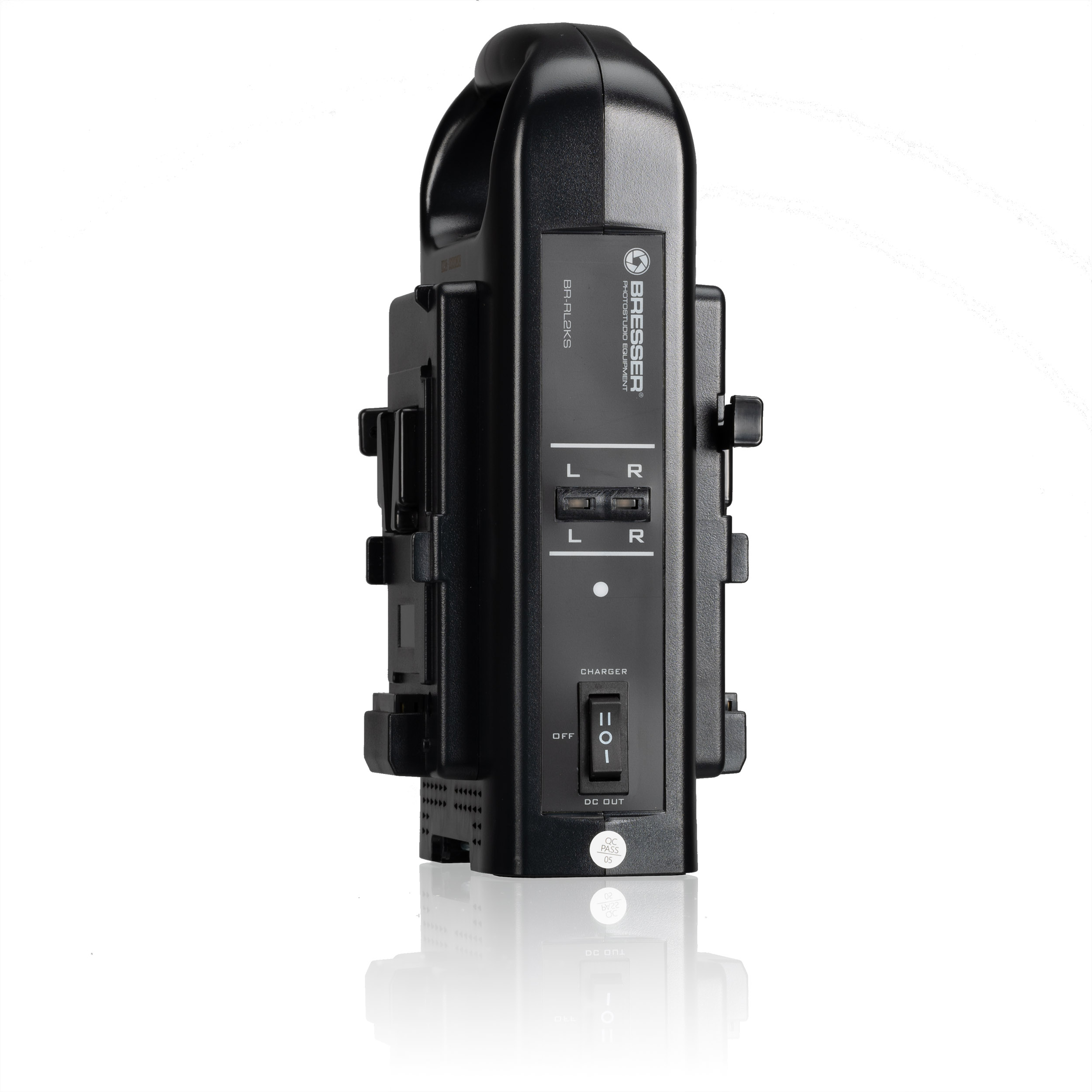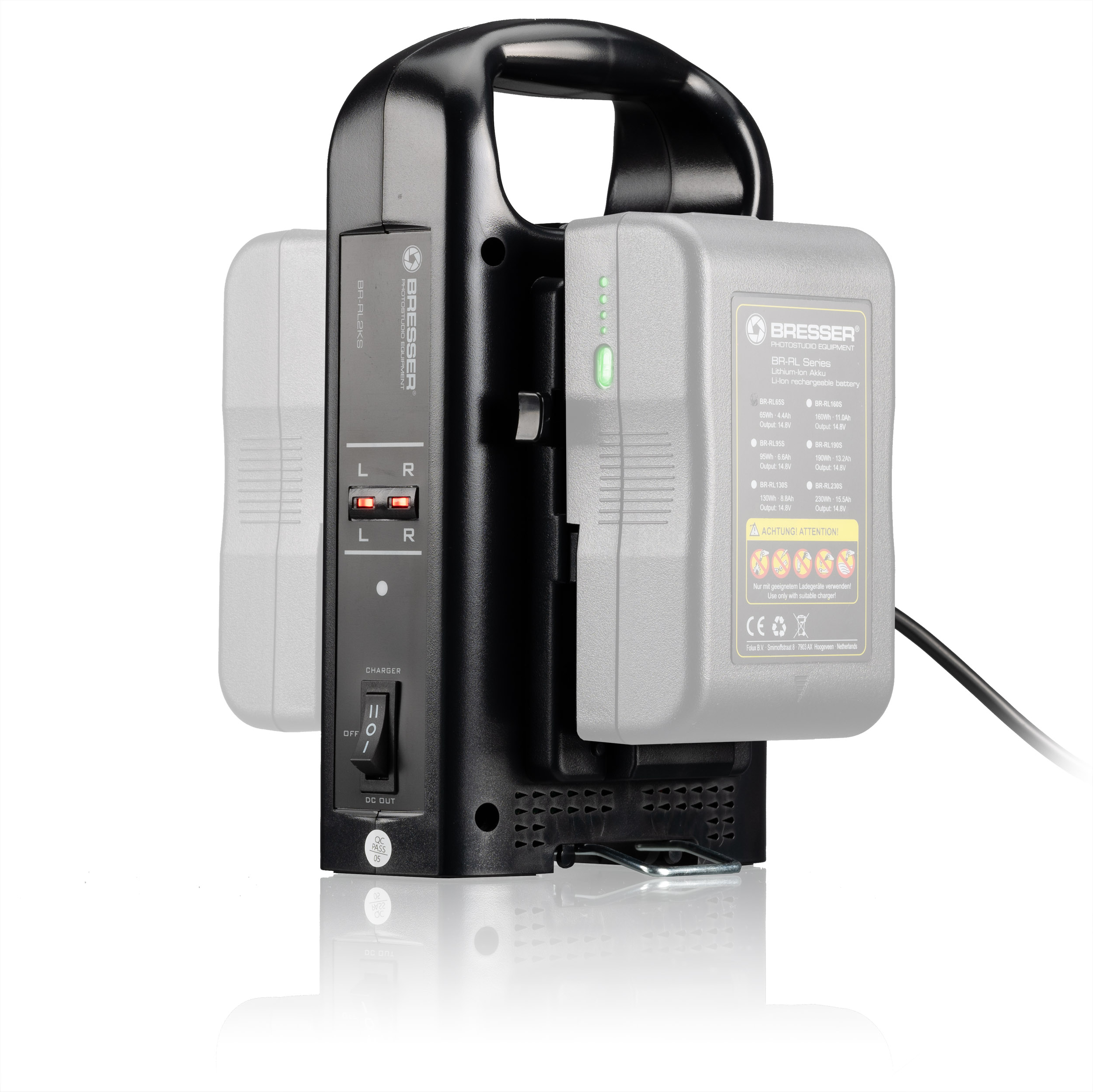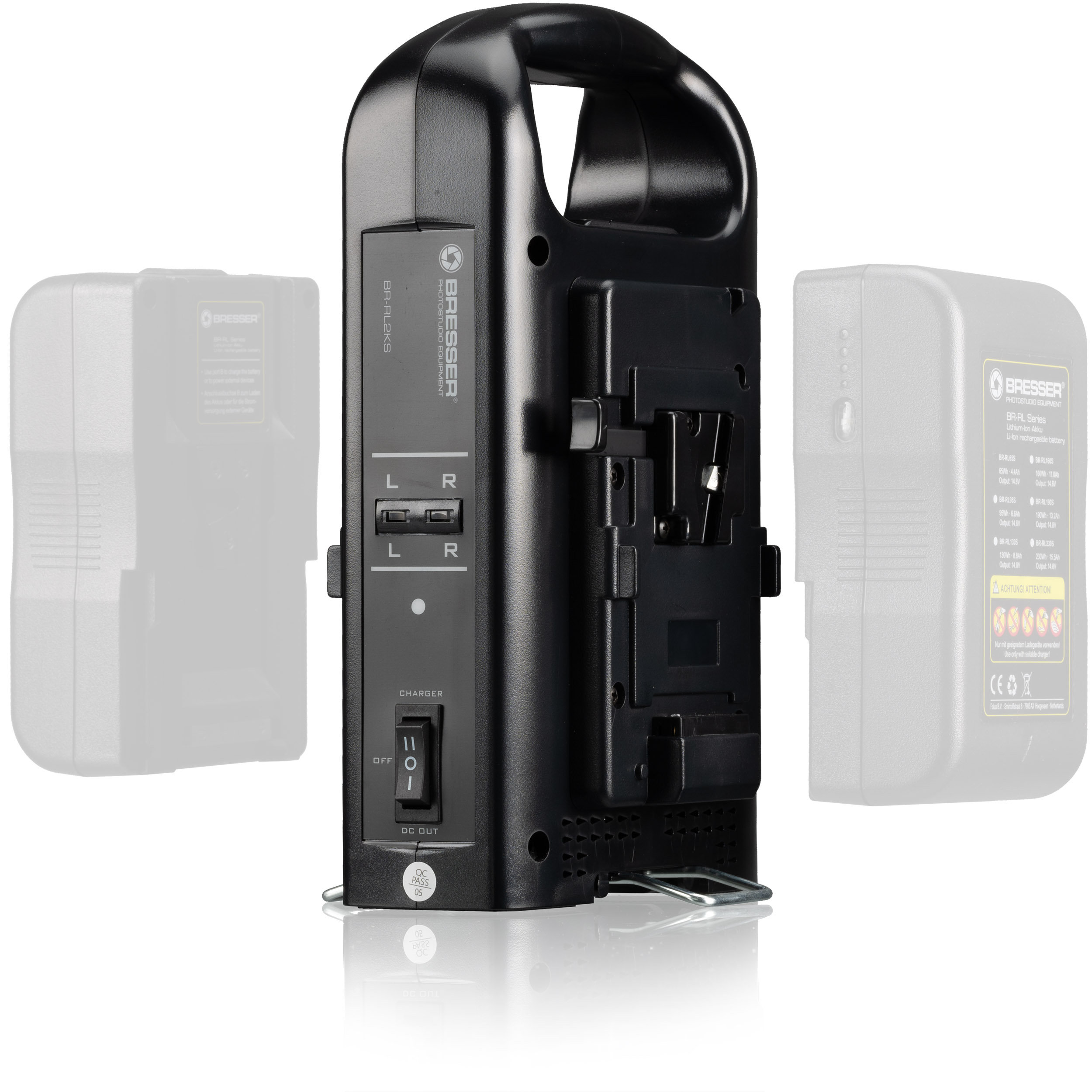 Túto duálnu nabíjačku možno použiť na nabíjanie všetkých batérií s pripojením V-Lock (vrátane batérií Bresser, Soca Land). Batérie možno pripojiť na stranu pomocou funkcie kliknutia a stav nabitia príslušnej batérie sa zobrazuje pod písmenami L a R. Pod nabíjačkou sa nachádza výklopný stojan, aby nabíjačka zostala vo vzpriamenej polohe.
