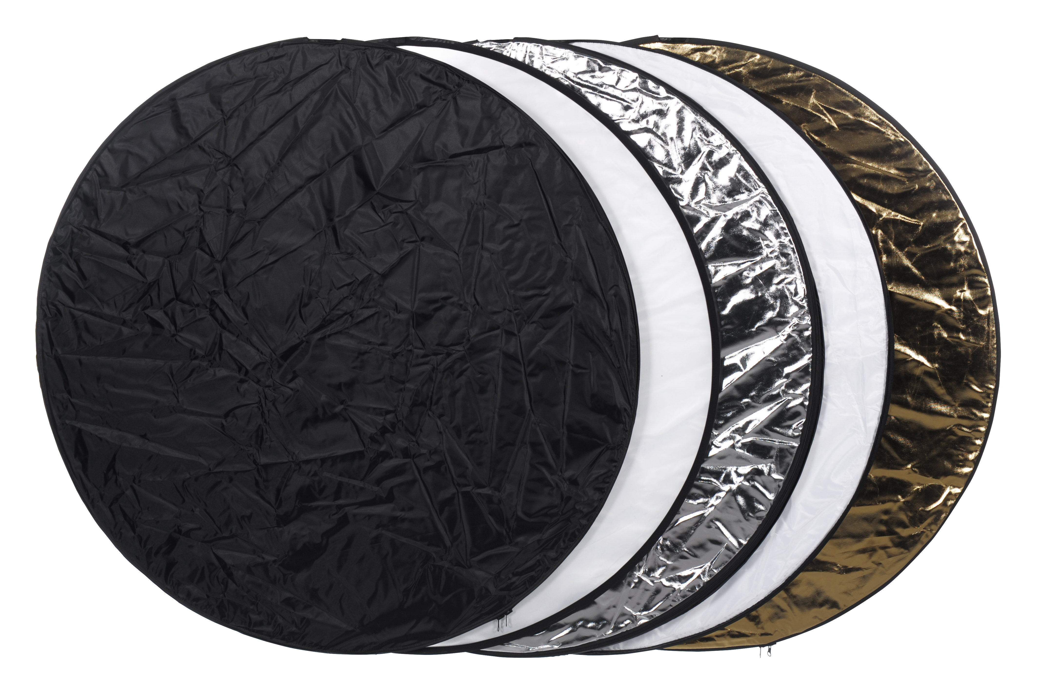 Okrúhly skladací reflektor BR-TR1 5v1 s priemerom 78 cm možno variabilne vybaviť rôznymi reflektormi a v zloženom stave ho môžete uložiť do tašky, čím ušetríte miesto. Hlavný rám je potiahnutý priesvitnou látkou , ktorú možno použiť ako difúzor, a BRESSER BR-TR1 má vďaka obojstrannému krytu so zipsom 4 rôzne odrazové fólie na 4 stranách (čiernu, zlatú, striebornú a bielu).