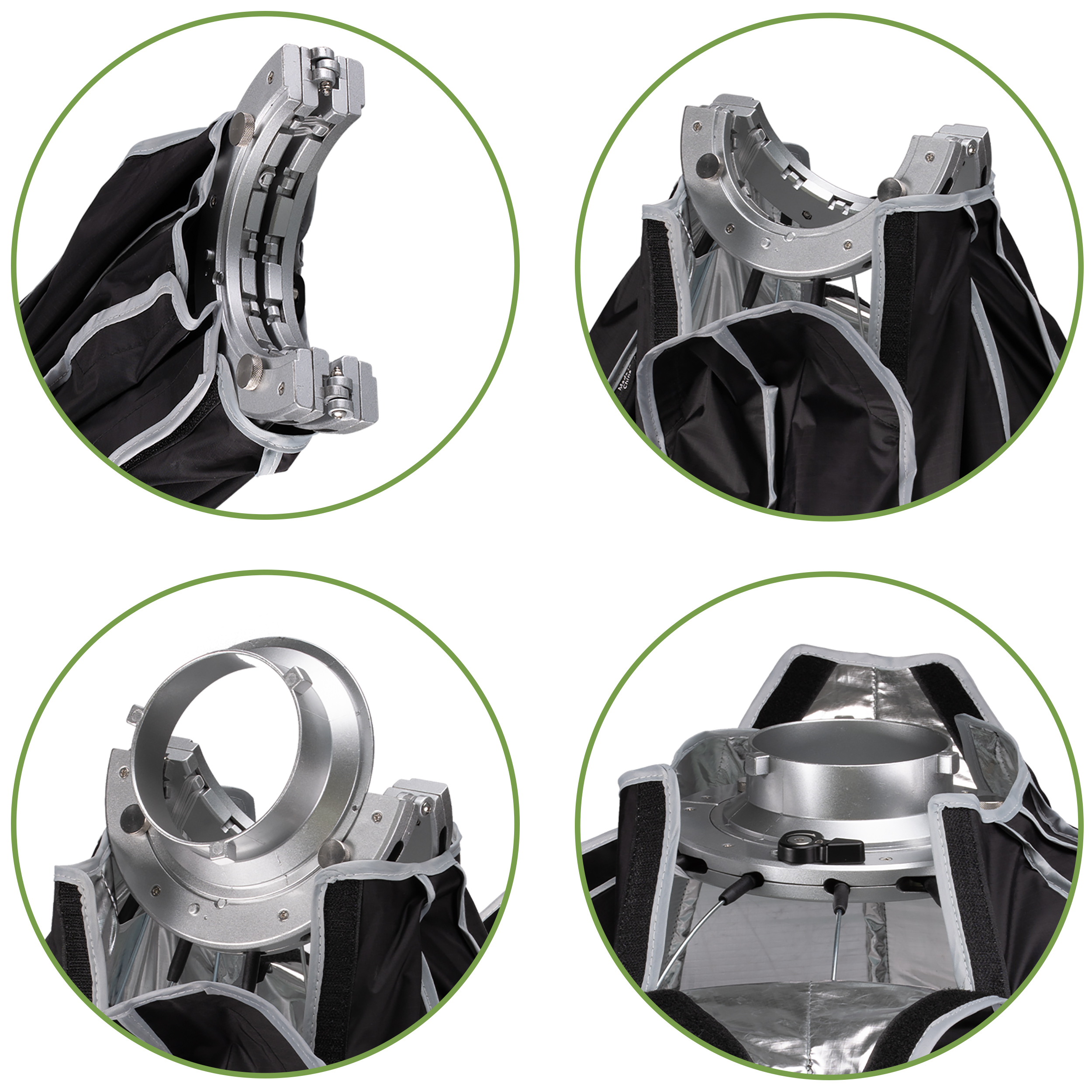 Vysoko reflexná vrstva softboxu BRESSER Parabolic Easy Lock Softbox maximalizuje svetelný výkon a vytvára pôsobivé odlesky na snímanom objekte. Zmena jasu, kontrastu a rozptylu bez horúcich bodov sa dosahuje pomocou odnímateľného vnútorného a vonkajšieho difúzora softboxu. Vďaka priemeru 90 cm, hĺbke 60 cm a praktickému kruhovému adaptéru Bowens možno hlboký softbox BRESSER používať s mnohými štúdiovými bleskami, dennými lampami a svetlami LED, ktoré majú pripojenie Bowens.
