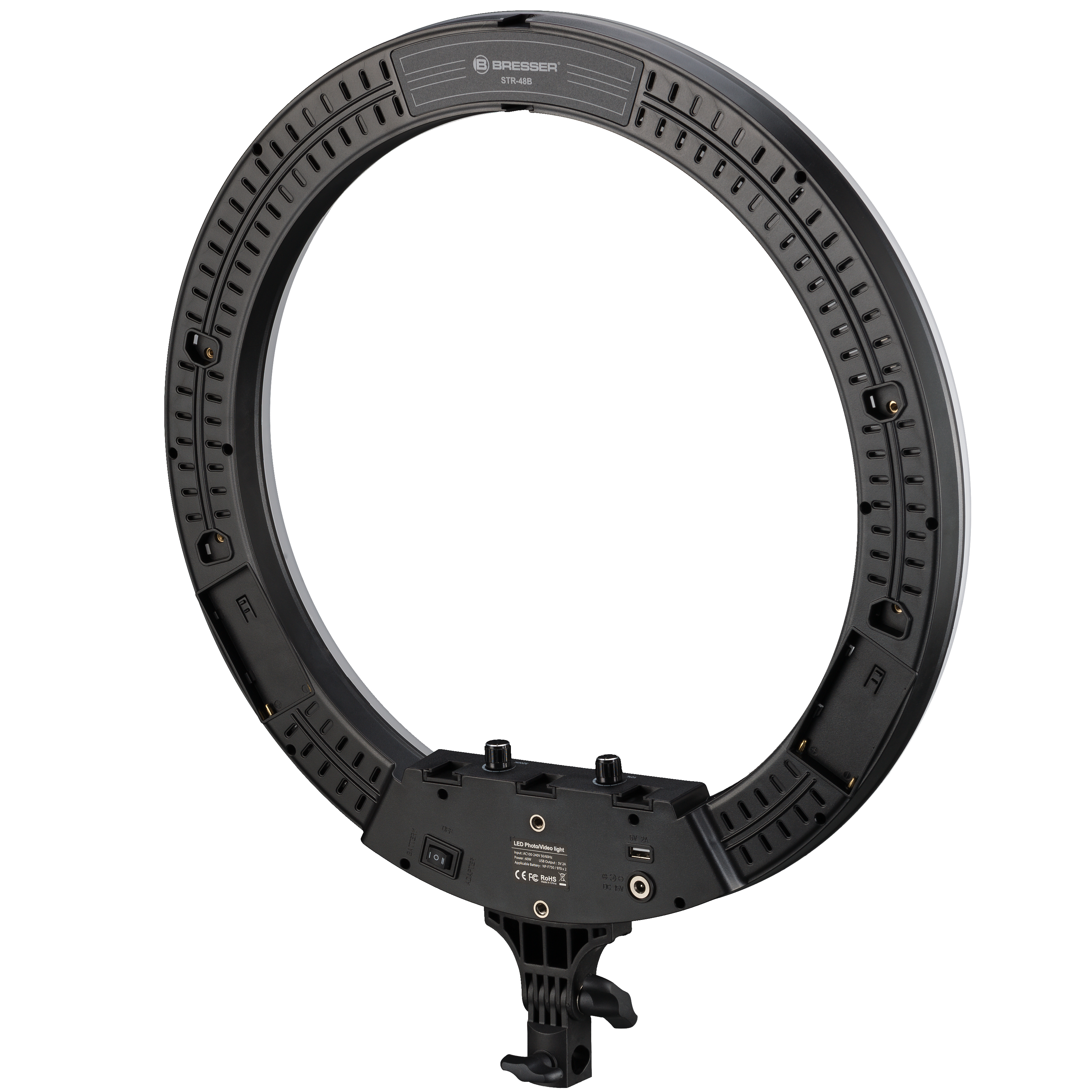 Svietidlo je vybavené 432 vysoko svietivými SMD LED diódami, z ktorých každá má výkon 0,2 W. Prstencové LED svetlo STR-48B má výkon 48 W a vyžaruje svetelný tok 4800 lúmenov , čo zaručuje výkonné a rovnomerné osvetlenie. Prstencové svetlo možno dokonale nastaviť pomocou dvoch otočných gombíkov . Intenzita svetla a teplota farieb sa dajú plynule nastaviť. Vďaka hodnote CRI viac ako 85 má kruhové svetlo prirodzené, živé farby.