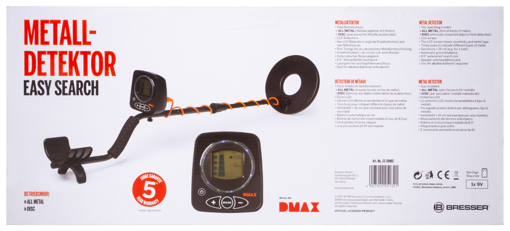 Detektor kovov DMAX Easy Search vám ponúka dve rôzne metódy detekcie železa, medi a striebra. Displej LCD je vybavený dvojfarebnou LED diódou na zobrazenie železa a farebných kovov. Rozlišovanie kovov prebieha pomocou troch rôznych zvukových signálov.