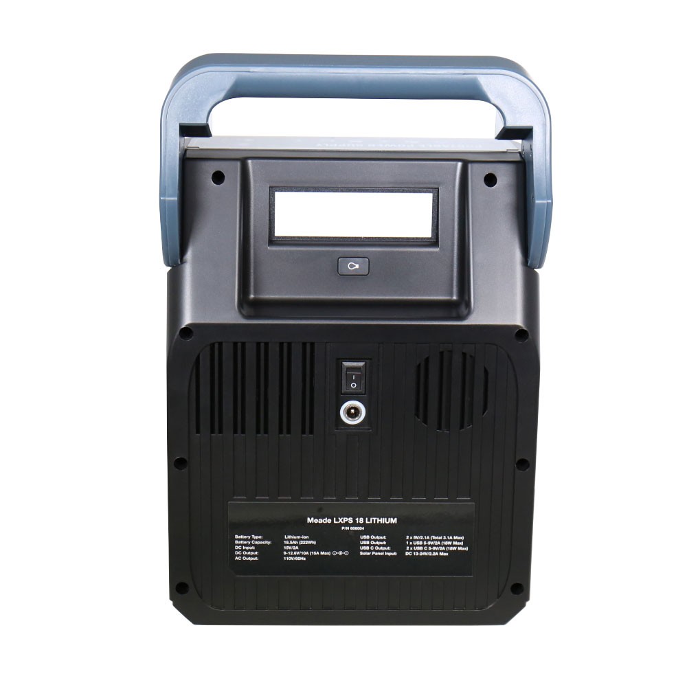 Lítiová batéria Meade LXPS 18 je lítium-iónová batéria s kapacitou 222 Wh a výstupom 12 V DC, ideálna na napájanie 12 V teleskopov. Obsahuje 110 V menič striedavého prúdu na napájanie notebooku alebo iného príslušenstva na zabezpečenie 110 V striedavého prúdu. Obsahuje aj 5 V USB porty na nabíjanie a môže napájať viacero elektronických zariadení súčasne, čo umožňuje vykonávať viacero činností počas pozorovania.