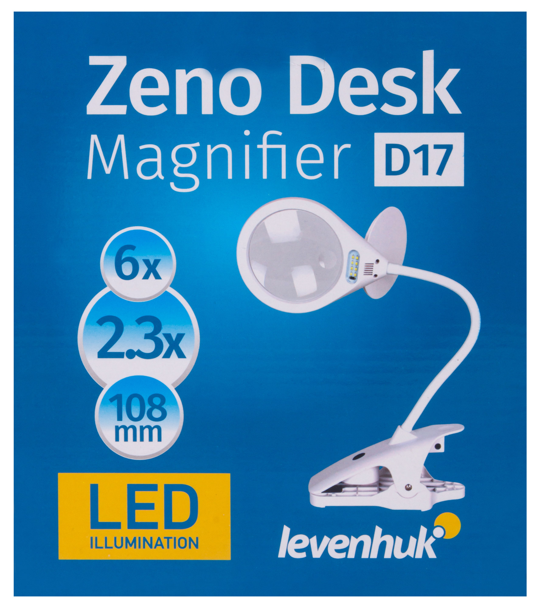 Levenhuk Zeno Desk D17 je praktická stolná lupa s veľkou bifokálnou šošovkou, jasným LED osvetlením a odolnou klipsou na upevnenie zariadenia na policiach, dvierkach skriniek, okrajoch stola atď. Je vhodná pre amatérske aj profesionálne použitie.