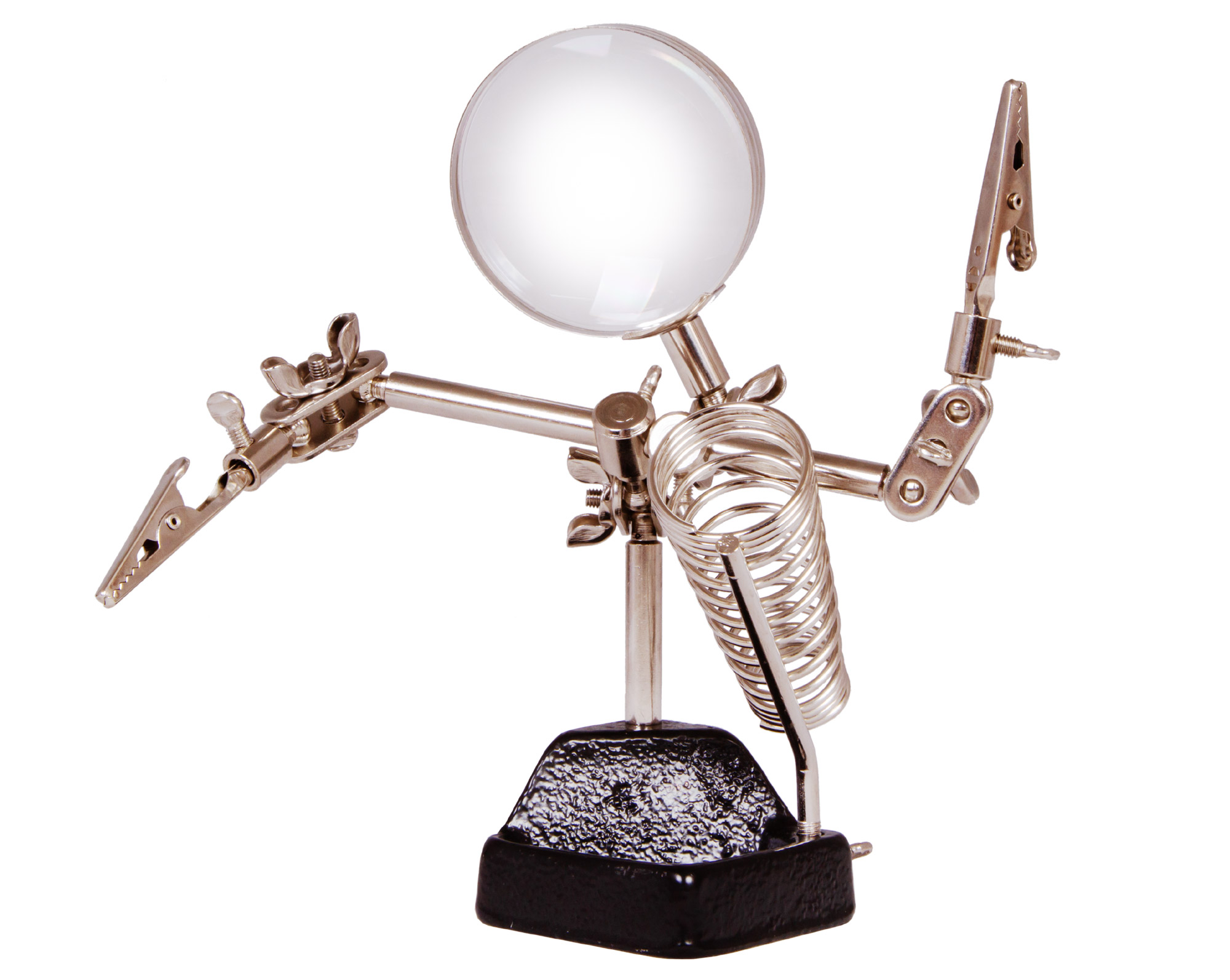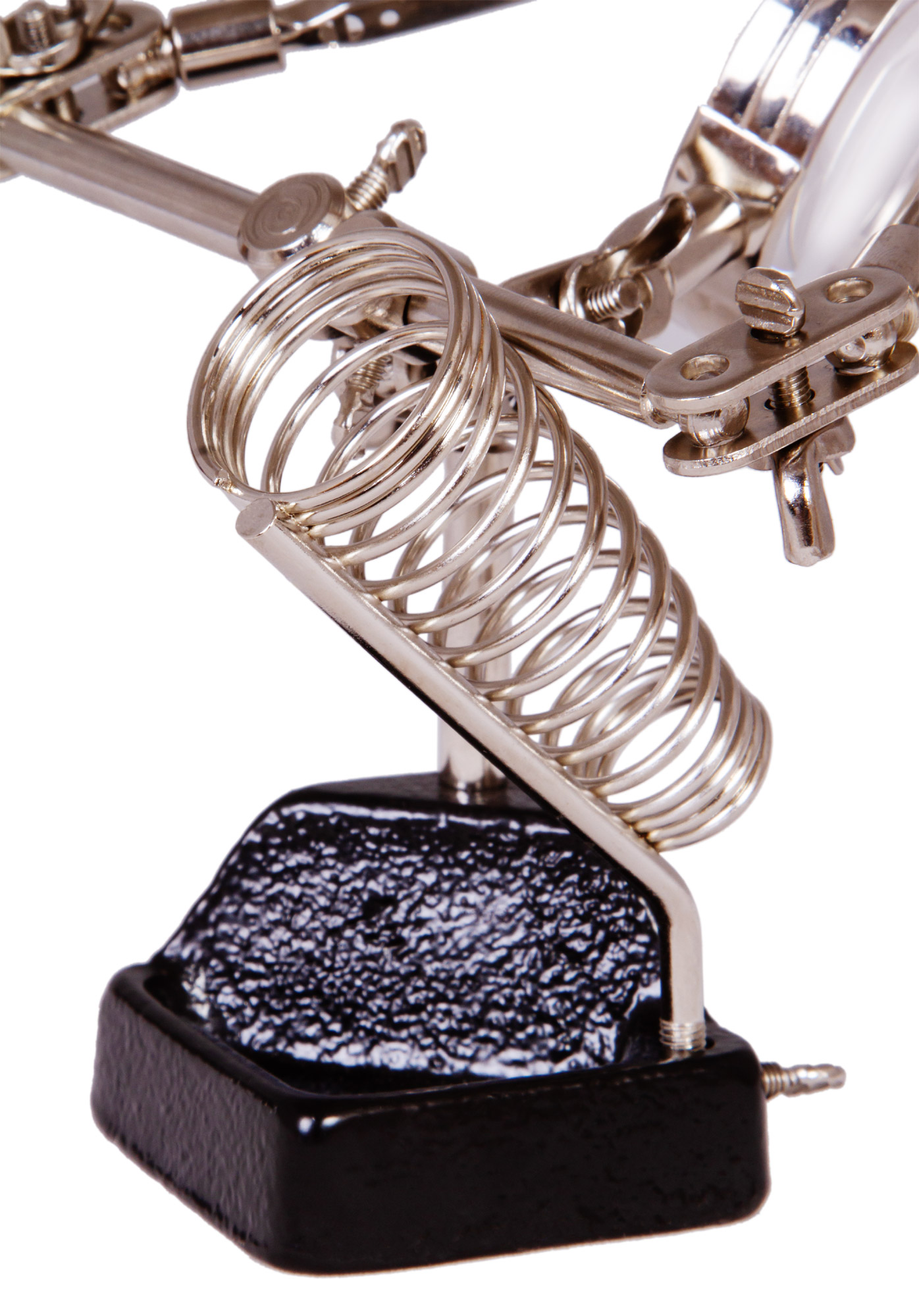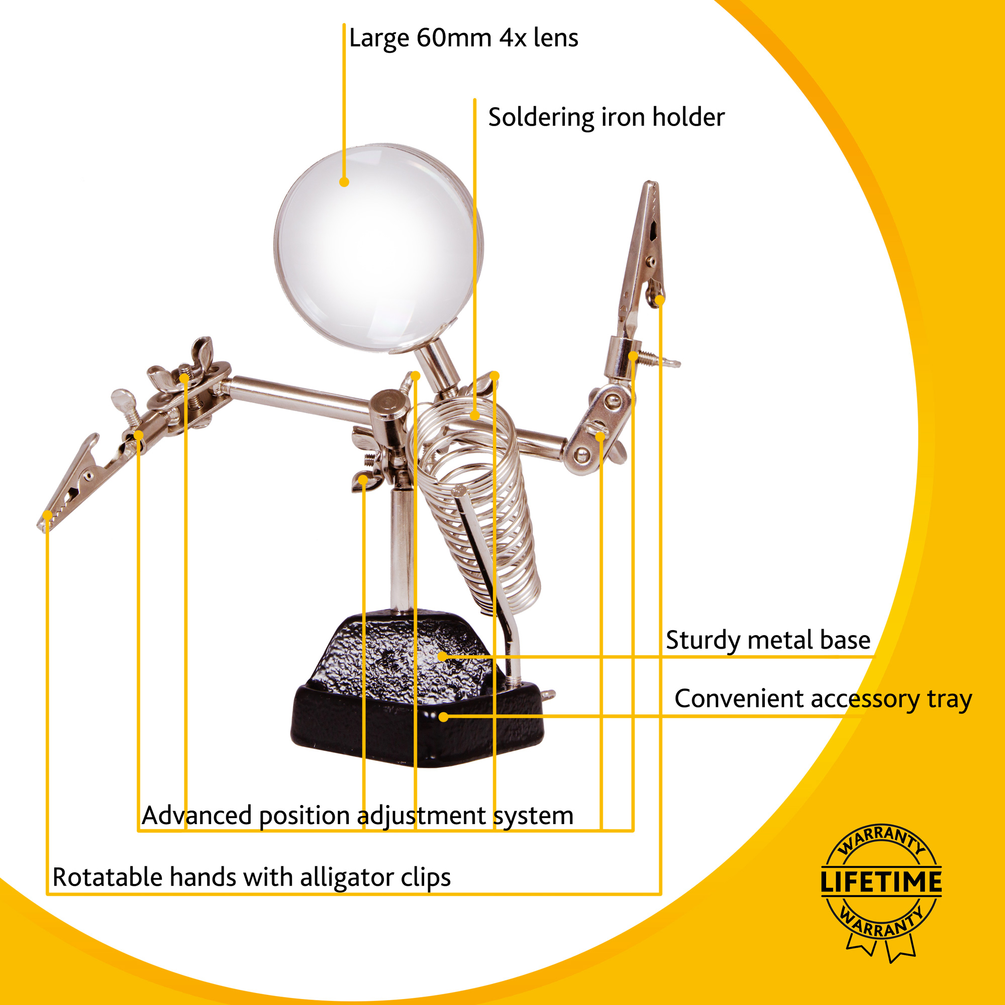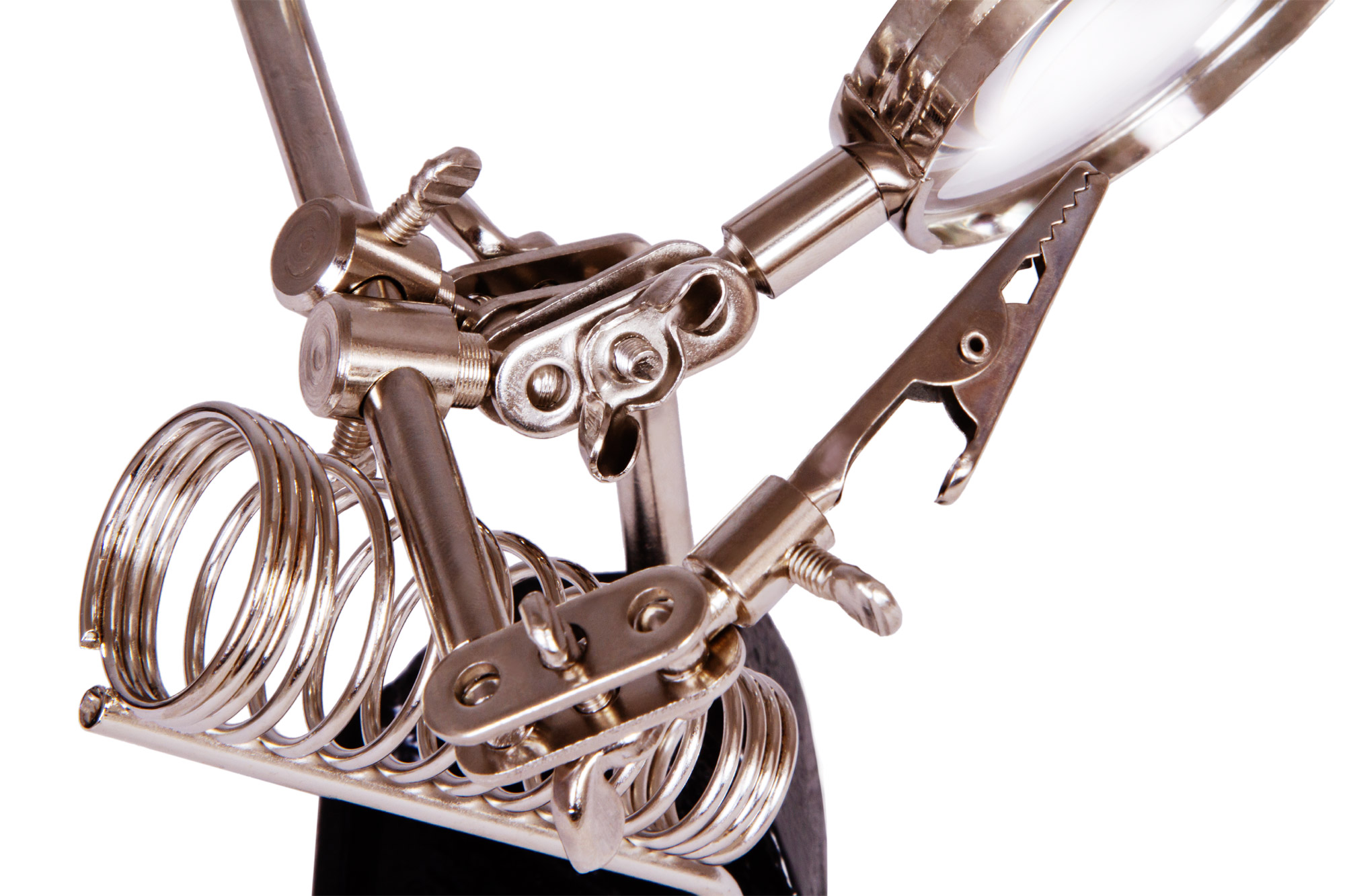 Šošovka je vyrobená z optického plastu a je umiestnená v odolnom kovovom ráme. Šošovku je možné horizontálne posúvať a otáčať do rôznych uhlov. Klipy sa používajú na držanie častí mechanizmov a elektronických dosiek v jednej polohe. Spájkovačku môžete vložiť do samostatného držiaka. Okrem toho je v základni lupy malá priehradka na drobnosti - skrutky, matice alebo podložky.