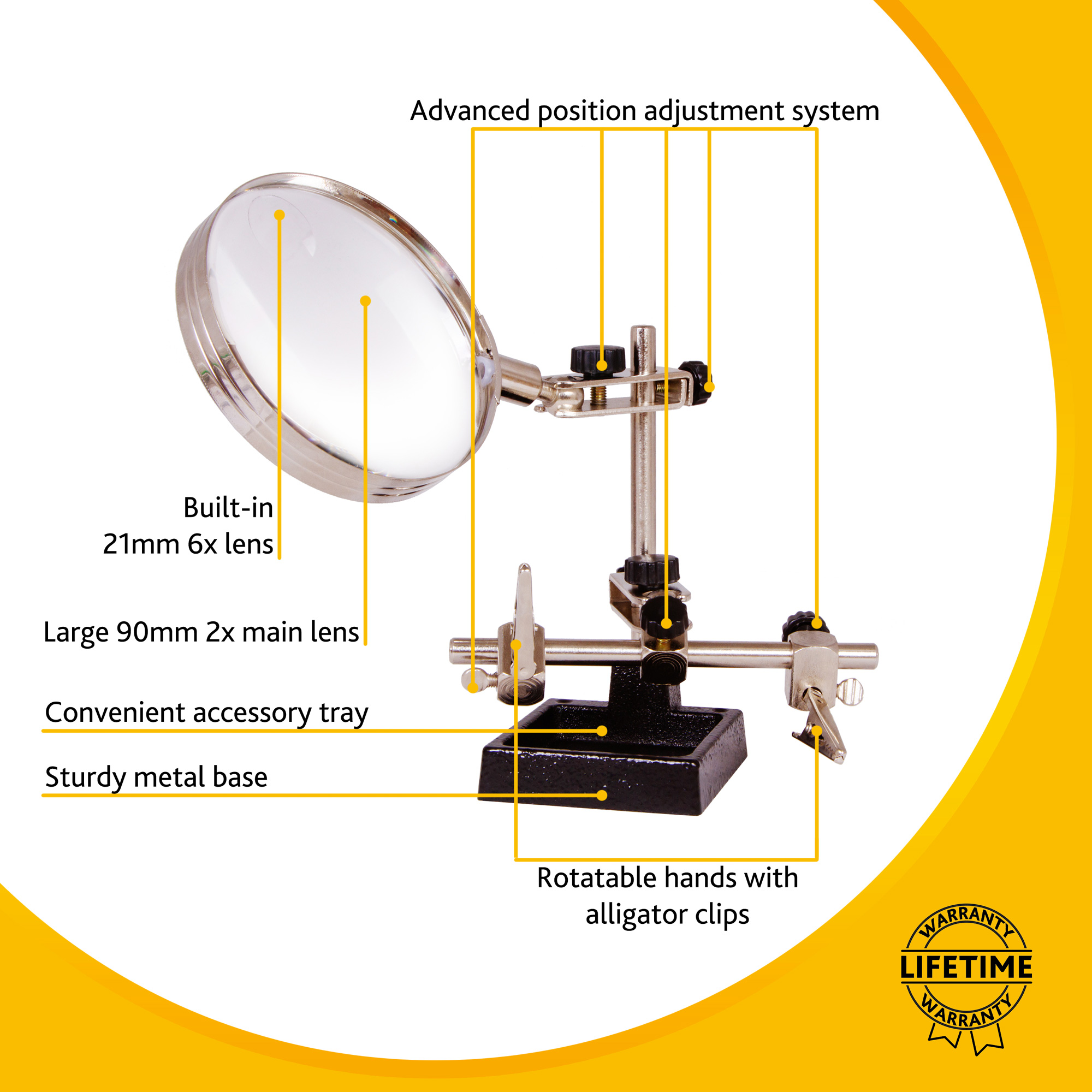 Levenhuk Zeno Refit ZF15 je lupa na vertikálnom statíve s dvoma držiakmi na menšie objekty. S ňou sa dá spájkovať, opravovať malé spotrebiče, maľovať makety, skumať šperky a vykonávať rôzne práce, ktoré si vyžadujú plné sústredenie a voľné ruky. Lupa je namontovaná na zaťaženej kovovej základni, stabilná a spoľahlivá.