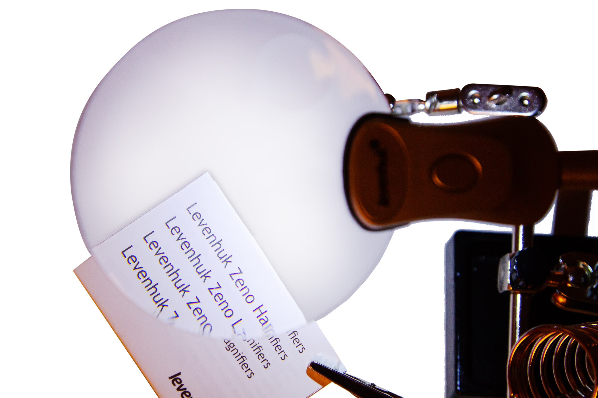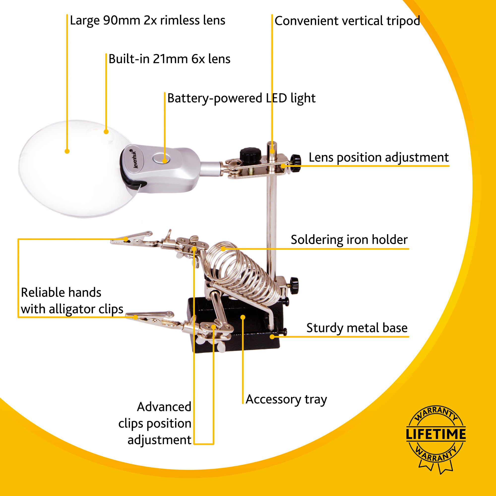 Držiaky sú umiestnené pod šošovkou. Dva z nich sú vybavené svorkami – v nich sa dá upevniť malý dielec alebo elektronickú dosku. Osobitná svorka je určená na inštaláciu spájkovačky. Rôzne drobné veci potrebné na prácu je možné vložiť do špeciálnej priehradky na príslušenstvo v základni.
