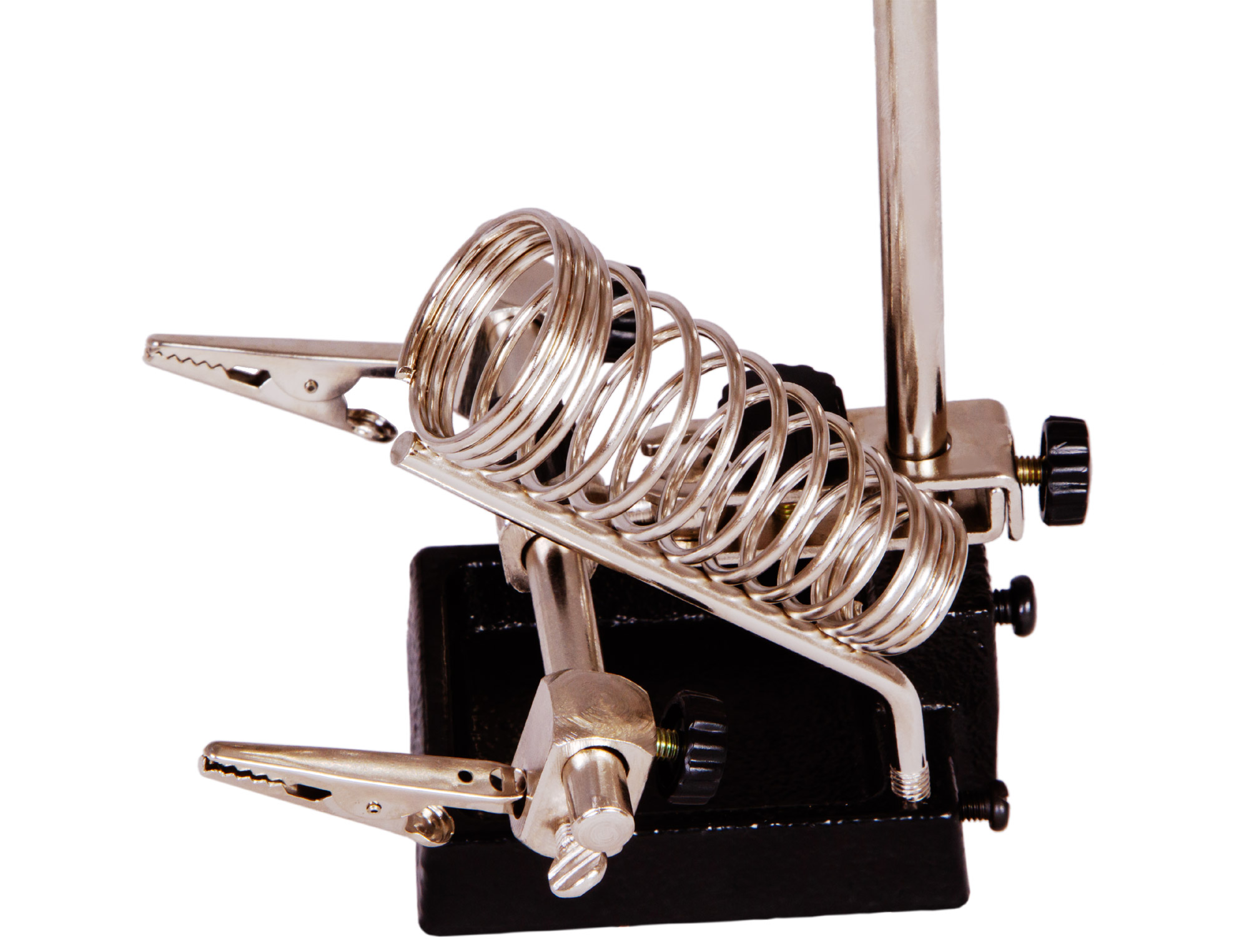 Pod šošovkou je umiestnený kovová tyč s dvoma držiakmi s klipsami. Neďaleko je držiak na spájkovačku. V základni je malá priehradka na príslušenstvo.