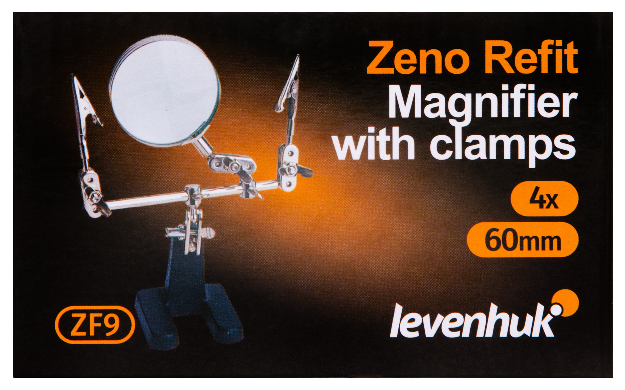 Levenhuk Zeno Refit ZF9 je statívová lupa s držiakmi „tretia ruka“. Dá sa použiť pri hodinárskych a šperkárskych prácach, modelovaní a opravách elektroniky, spájkovaní a lakovaní dielov. Lupa nájde svoje uplatnenie ako na stole koničkára, tak aj v dielni profesionála.