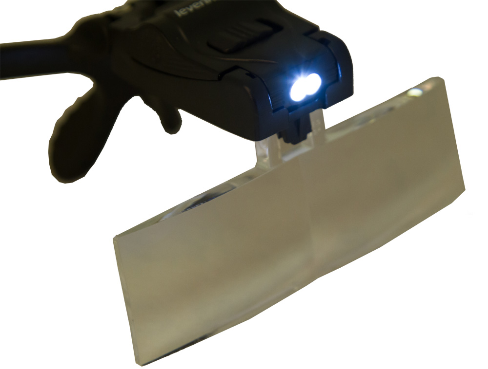 Lupa má zabudované LED osvetlenie. Dve jasné LED diódy osvetľujú pracovnú plochu rovnomerne a jasne, čo umožňuje vykonávať presnú prácu aj v tmavej miestnosti. Batérie na napájanie osvetlenia sú súčasťou balenia.