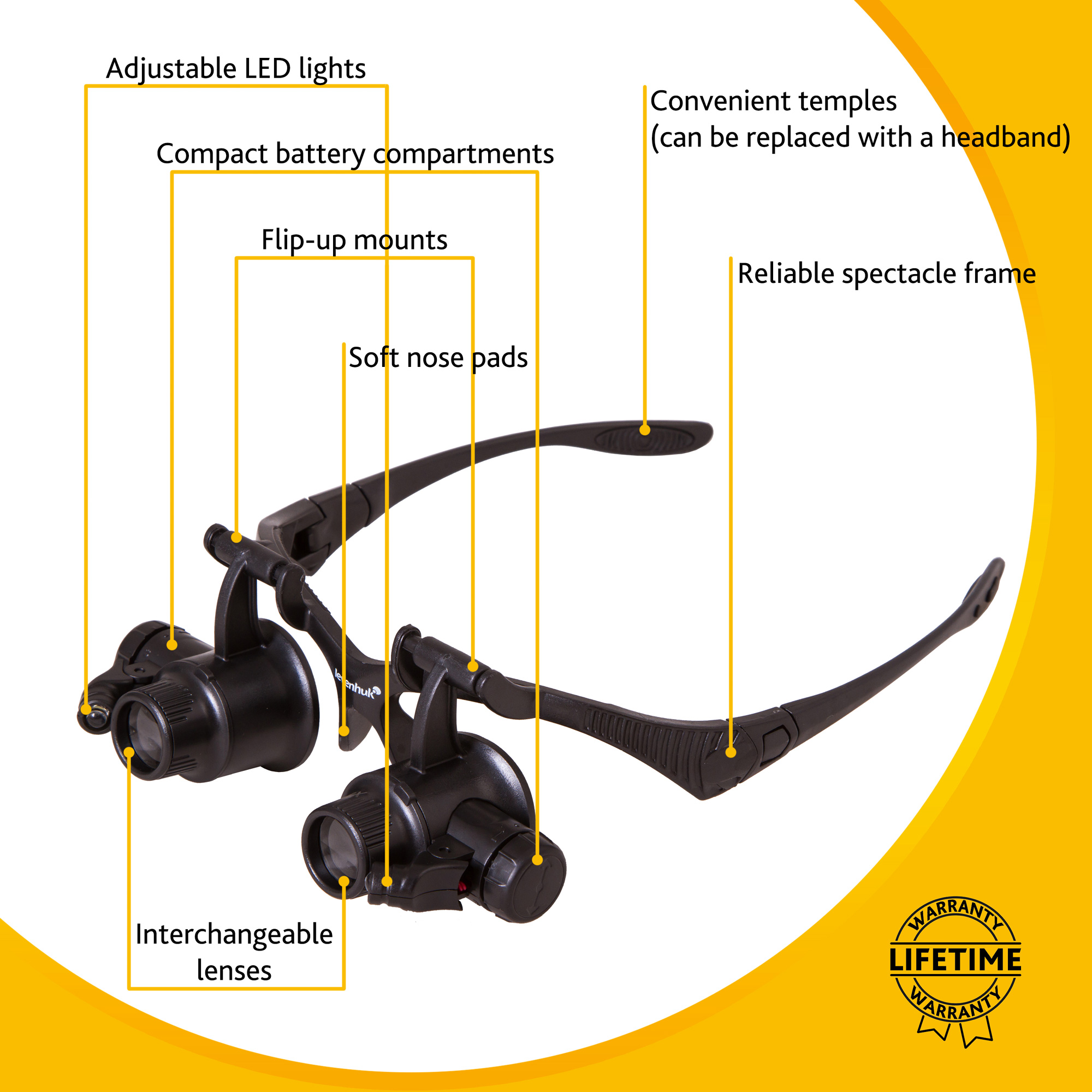 Okuliarová lupa Levenhuk Zeno Vizor G4 bude užitočná pre ľudí, ktorí profesionálne pracujú s malými predmetmi a potrebujú zariadenie s veľkým zväčšením. Táto lupa je ideálna pre dlhodobé klenotnícke, hodinárske alebo opravárenské práce. Je vybavená vstavaným osvetlením, dodáva sa s vymeniteľnými šošovkami a má pohodlný okuliarový rám.