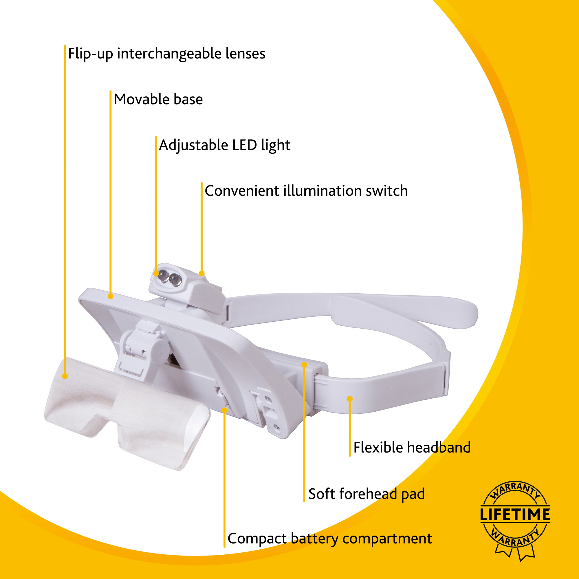Táto lupa je ideálna pre akúkoľvek presnú prácu. Nainštalovanú šošovku je možné kedykoľvek vyklopiť hore, aby ste mohli pokračovať v práci bez zväčšenia, a vrátiť ju späť pre podrobné prezretie pracovnej oblasti. LED osvetlenie je nevyhnutné pre ľudí, ktorých pracovisko nie je vybavené osvetlením. Je jasné, čiže ideálne do tmavých miestností. Je praktické, že osvetlenie je napájané štandardnými batériami, ktoré je možné zakúpiť v každom obchode. Uhol osvetlenia je nastaviteľný.