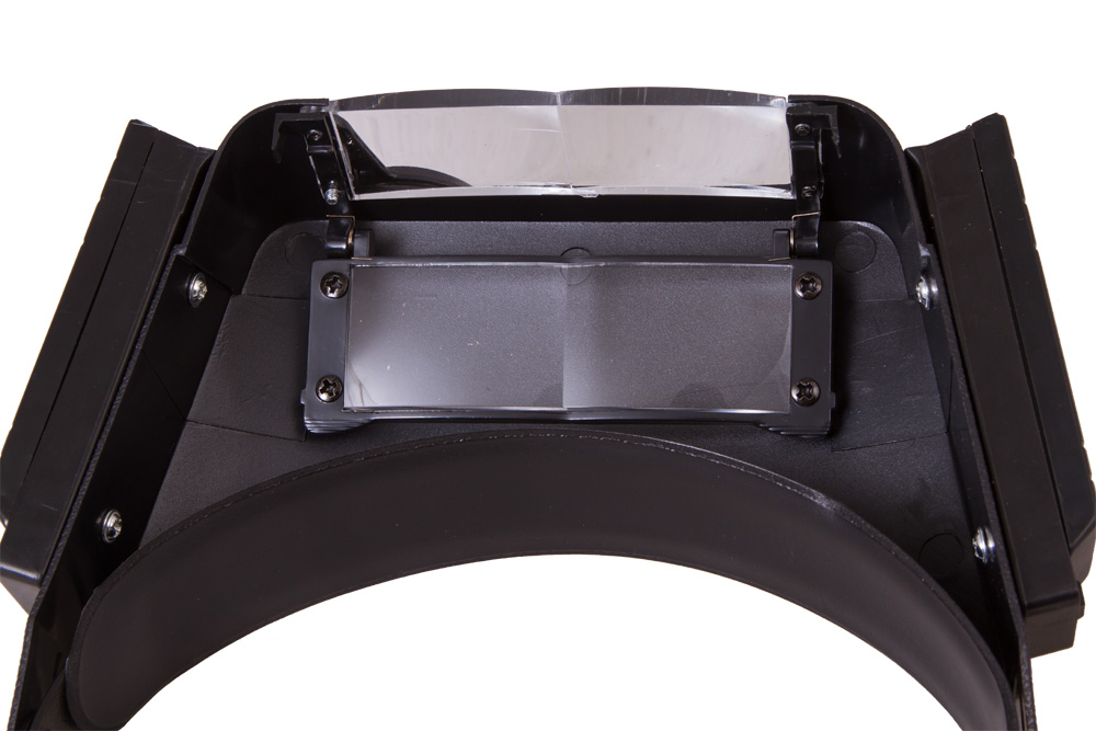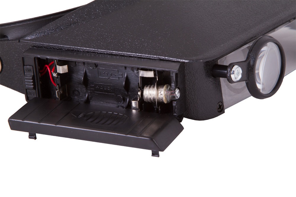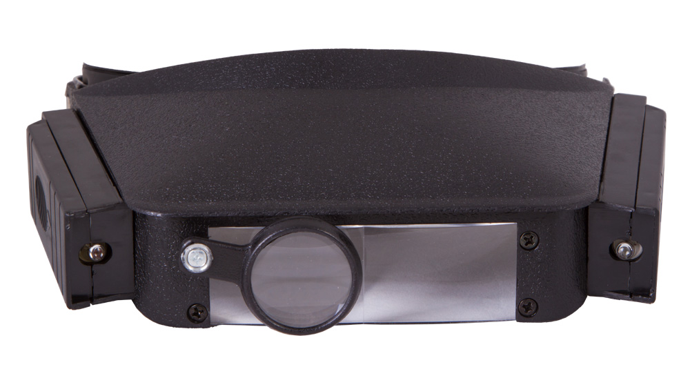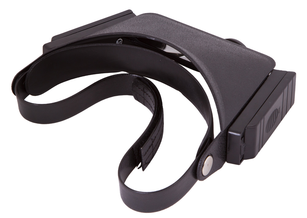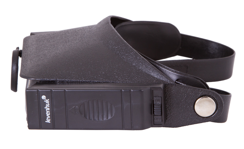 Lupa má pružnú čelenku na suchý zips, ktorej dĺžka je nastaviteľná. S ňou môžete lupu spoľahlivo pripevniť na hlavu a nechať ruky voľné. Na ľavej a pravej strane tela lupy sa nachádzajú jasné osvetľovacie lampy, ktoré umožňujú používať Levenhuk Zeno Vizor H1 aj pri slabom osvetlení. Osvetlenie je napájané AAA batériami (predávajú sa samostatne, nie sú súčasťou balenia).