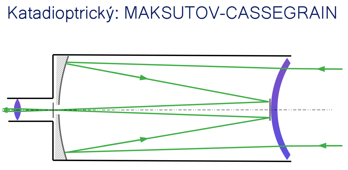 Cassegrain - Celá optická sústava leží v jednej osi symetrie, Pozostáva z Primárneho zrkadla, ktoré má otvor v strede, sekundárneho zrkadla, ktoré odráža svetlo smerom do otvoru v primárnom zrkadle, za ktorým je následne umiestnený okulár.