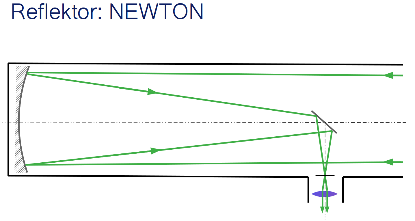 Newton - Optická sústava pozostáva z tubusu, primárneho zrkadla (guľového alebo parabolického), sekundárneho zrkadla (nakloneného o 45° ktoré odráža svetlo kolmo do okuláru kde je ostrenie zabezpečené okulárovým výťahom).