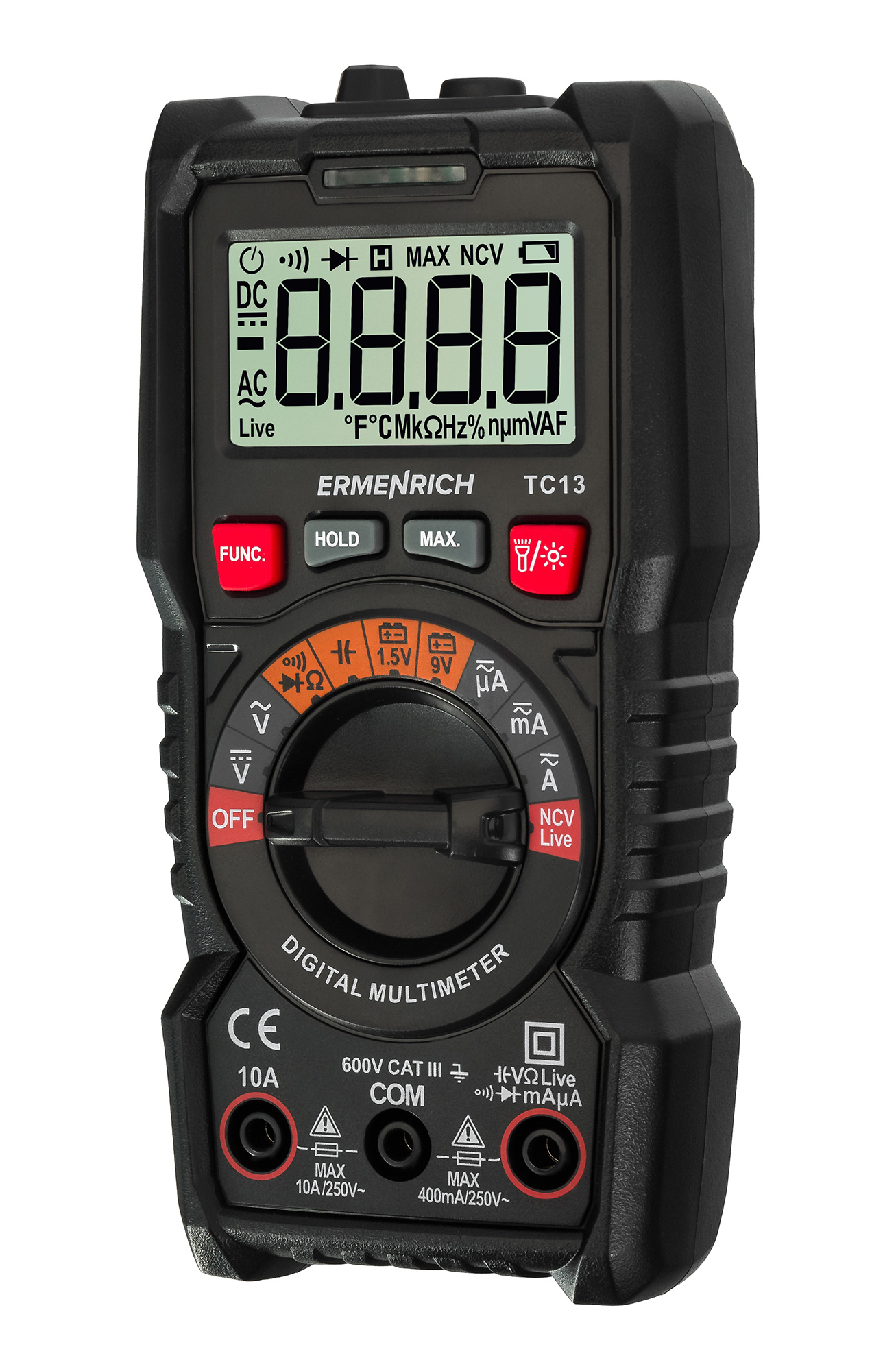 Digitálny multimeter Ermenrich Zing TC13 je multifunkčný prenosný prístroj na testovanie elektrických sietí a meranie charakteristík elektrických signálov. Prístroj je určený na profesionálne použitie technickými pracovníkmi, ale môže byť vhodný aj pre nekvalifikovaných pracovníkov na použitie v domácnosti. Okrem napätia, prúdu a odporu dokáže Ermenrich Zing TC13 merať aj kapacitu, frekvenciu a pracovný cyklus.