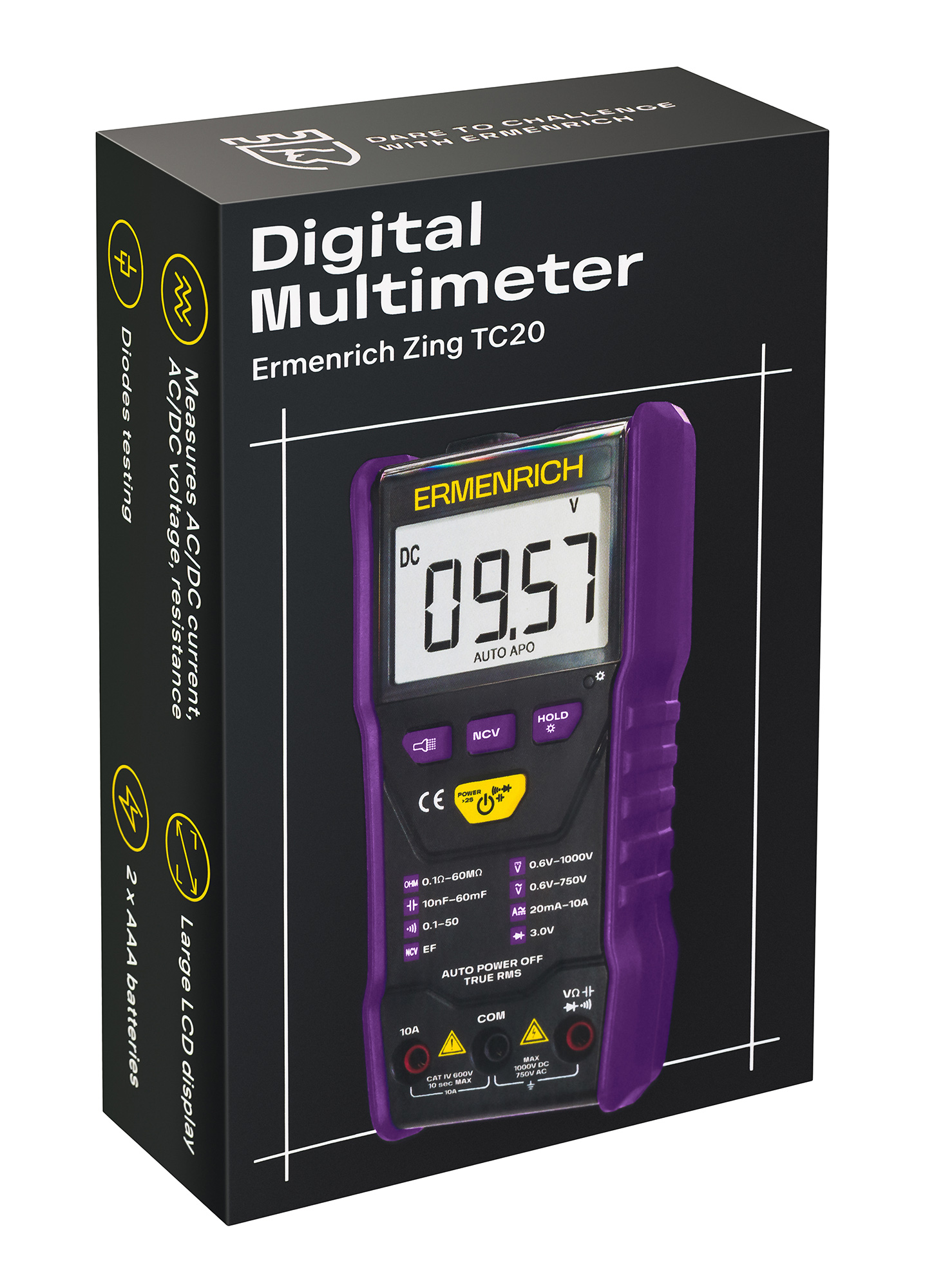 Digitálny multimeter Ermenrich Zing TC20 je prenosný prístroj na meranie napätia DC/AC, prúdu DC/AC, odporu a kapacity. Nemá otočný prepínač, t. j. hranica merania sa nastavuje automaticky. Prístroj je chránený proti preťaženiu, je spoľahlivý a stabilný a poskytuje vysokú presnosť merania. Je najvhodnejší pre záujemcov o rádiovú komunikáciu, domácich majstrov a profesionálnych elektrikárov.