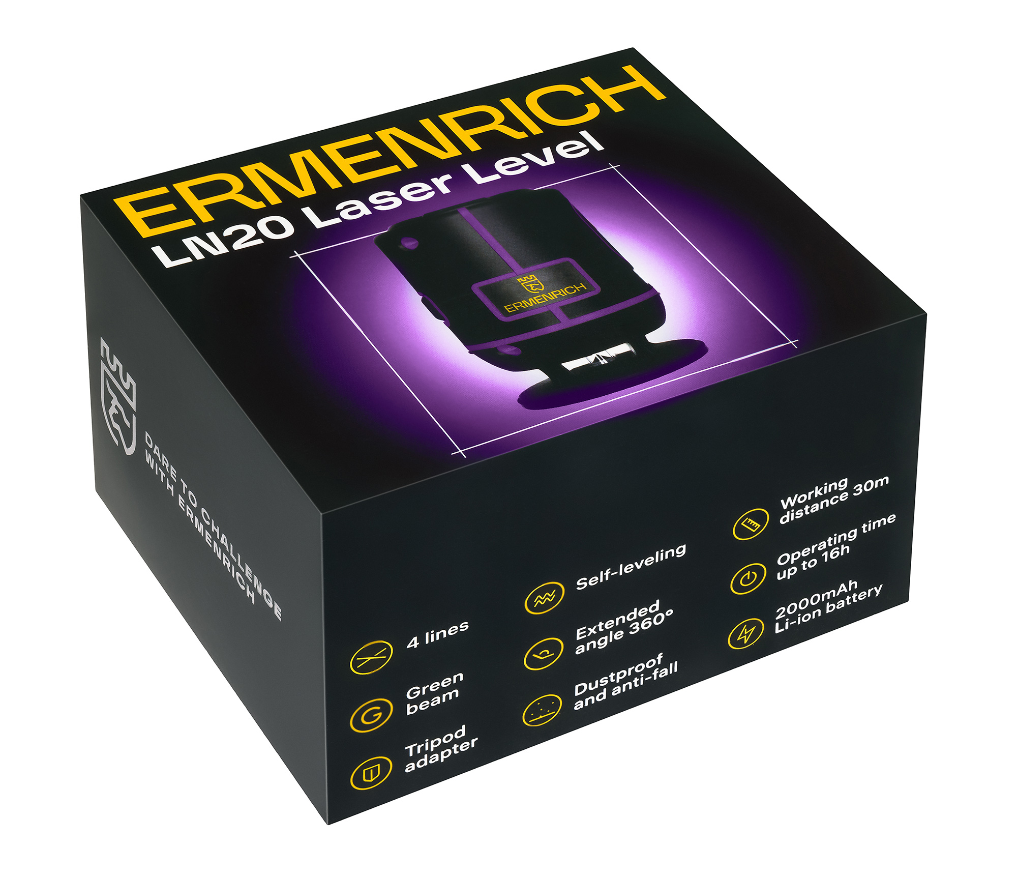 Ermenrich LN20 je samonivelačný laserový prístroj, ktorý generuje štyri čiary zelenej farby v horizontálnej rovine. Horizontálny rozptyl je plných 360°. Pomôcka je ideálna na použitie pri stavebných a renovačných prácach, ako aj na inštaláciu zariadení a osvetlenia. Veľká pracovná vzdialenosť vám umožní pokryť veľký obvod bez toho, aby ste museli zariadenie premiestňovať – môže dosiahnuť aj na vzdialený múr. Kompenzátor znižuje vibrácie a automaticky vyrovnáva rovinu laserových čiar.