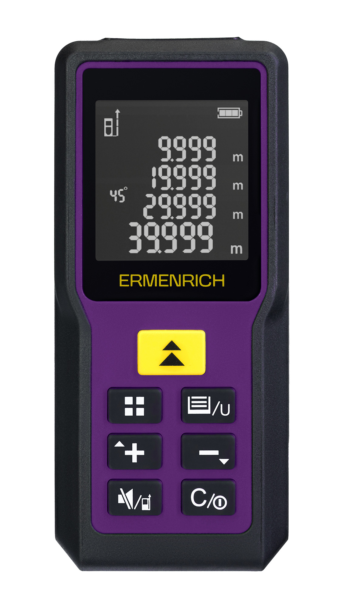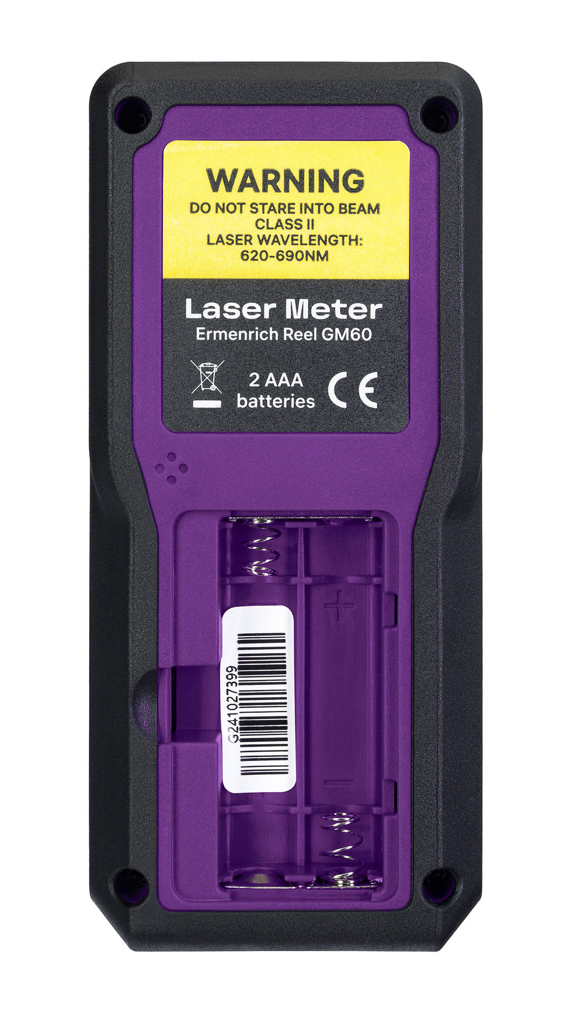 Laserový merač Ermenrich Reel GM60 je užívateľsky prívetivý vďaka svojmu kompaktnému dizajnu a veľkému štvorriadkovému displeju. K dispozícii je režim jednotlivého merania vzdialenosti aj režim kontinuálneho skenovania a tiež niekoľko rôznych jednotiek merania. Profesionáli ocenia jeho tichý režim – môžete pracovať v tichosti vypnutím zvukových upozornení. Prístroj je napájaný 2 štandardnými batériami AAA, pričom jedna sada batérií vystačí na viac ako 5 000 meraní. Pre úsporu energie je k dispozícii funkcia automatického vypnutia laserového lúča a samotného prístroja. Do záznamu histórie prístroja je možné uložiť veľké množstvo dát – 100 skupín meraní.