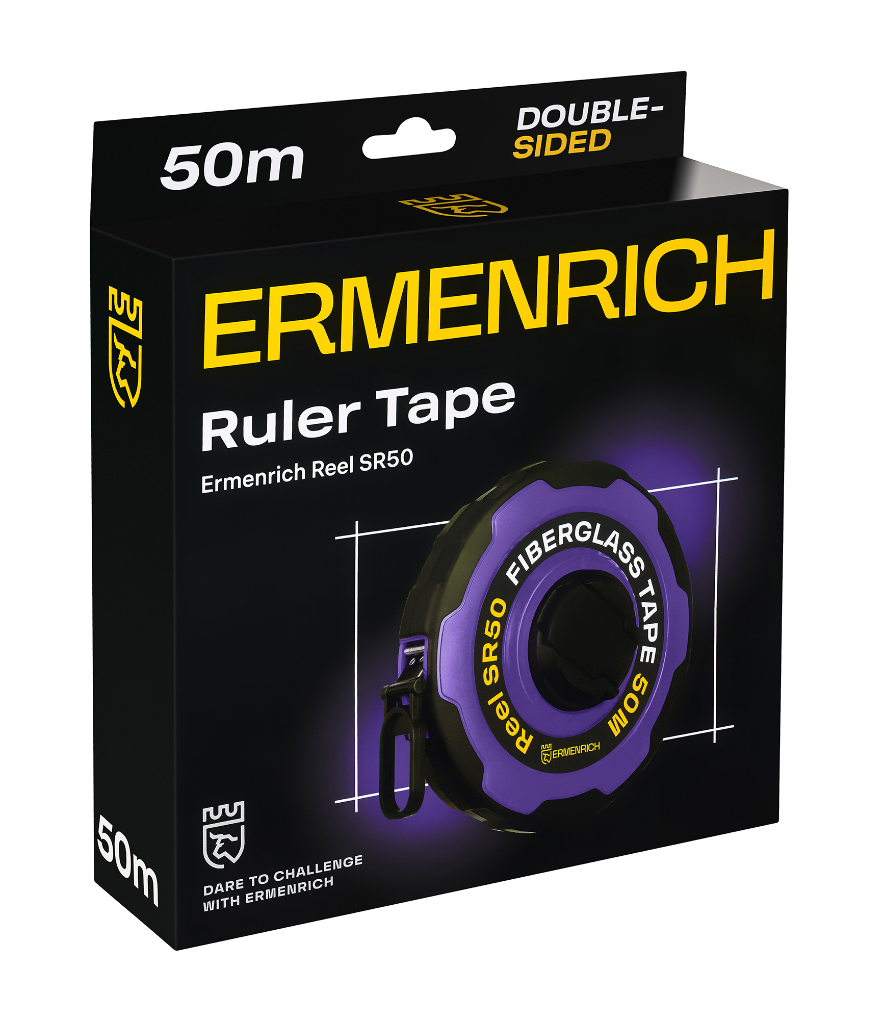 Zvinovací meter Ermenrich Reel SR50 je určený na meranie dĺžky do 50 metrov. Ide o sklolaminátové pásmo s obojstrannou stupnicou. Pásmo je uložené v odolnom diskovom kryte z ABS plastu. Na jeho konci je veľký, ľahko použiteľný háčik. Kľučka na boku kotúča slúži na navíjanie pásky. Kľučku je možné zložiť, pokiaľ sa nepoužíva.
