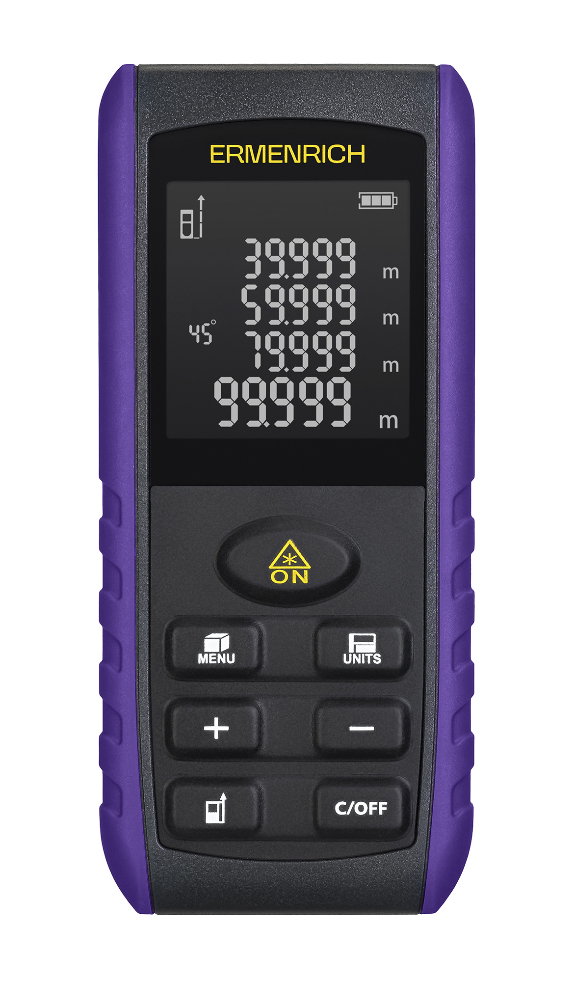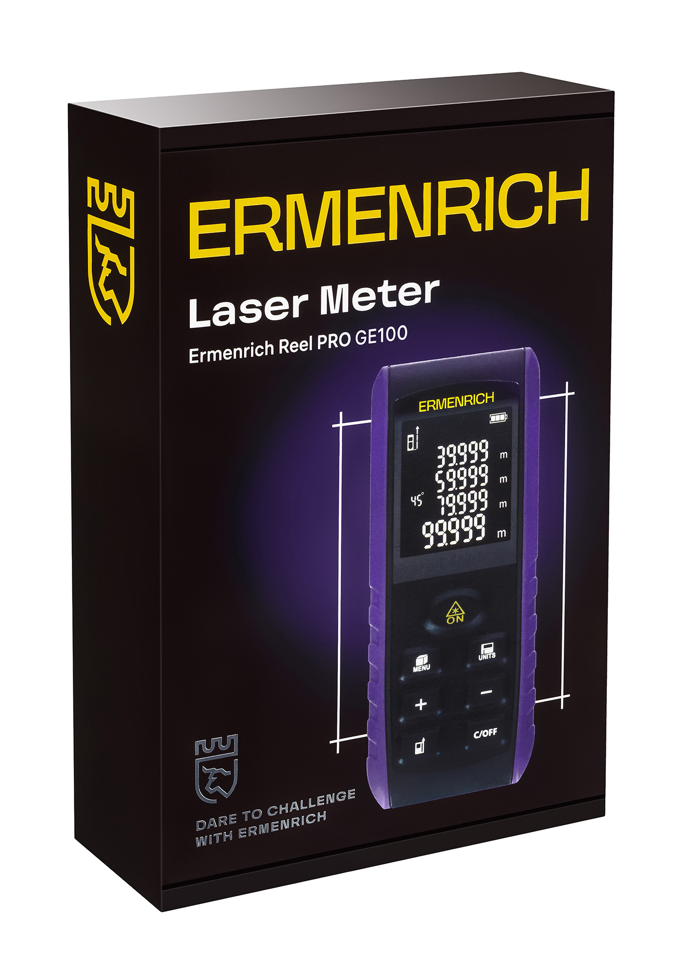 Laserové meracie zariadenie Ermenrich Reel GE100 je kompaktný prístroj na rôzne úlohy v stavebníctve, opravárenstve a každodennom živote. Dokáže určiť vzdialenosť od bodu k bodu s presnosťou 2 milimetre, vypočítať plochu, objem a merať uhly objektov. Merač má aj funkciu Pytagorovej vety - výpočet vzdialeností pomocou medzivýpočtov. To je užitočné, ak nie je možné umiestniť merač na požadovaný bod alebo ak je v dráhe lúča prekážka.